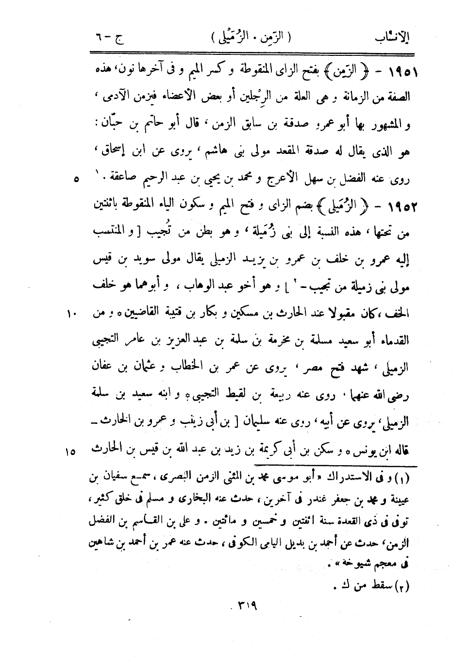 [1] وفي الاستدراك «أبو موسى محمد بن المثنى الزمن البصري، سمع سفيان بن عيينة ومحمد بن جعفر غندر في آخرين، حدث عنه البخاري ومسلم في خلق كثير، توفى في ذي القعدة سنة اثنتين وخمسين ومائتين. وعلى بن القاسم بن الفضل الزمن، حدث عن أحمد بن بديل اليامى الكوفي، حدث عنه عمر بن أحمد بن شاهين في معجم شيوخه» .