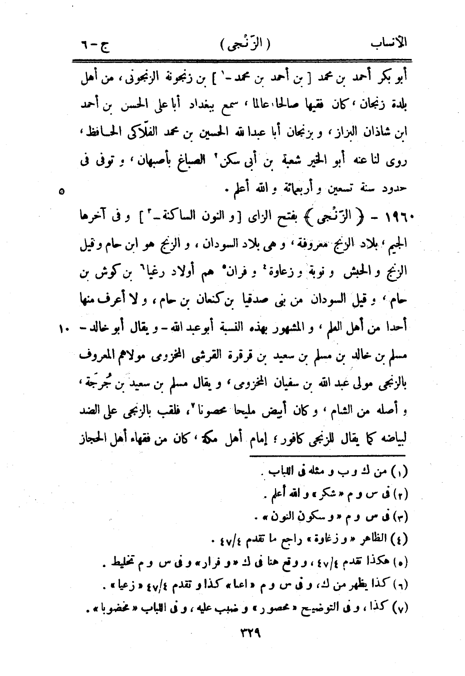 بفتح الزاى [والنون الساكنة-[3]] وفي آخرها الجيم، بلاد الزنج معروفة، وهي بلاد السودان، والزنج هو ابن حام وقيل الزنج والحبش ونوبة وزعاوة [4] وفران [5] هم أولاد رغيا [6] بن كوش بن حام، وقيل السودان من بنى صدقيا بن كنعان بن حام، ولا أعرف منها أحدا من أهل العلم، والمشهور بهذه النسبة أبو عبد الله- ويقال أبو خالد- مسلم بن خالد بن مسلم بن سعيد بن قرقرة القرشي المخزومي مولاهم المعروف بالزنجي مولى عبد الله بن سفيان المخزومي، ويقال مسلم بن سعيد بن جرجة، وأصله من الشام، وكان أبيض مليحا محصونا [7] ، فلقب بالزنجي على الضد لبياضه كما يقال للزنجى كافور، إمام أهل مكة، كان من فقهاء أهل الحجاز