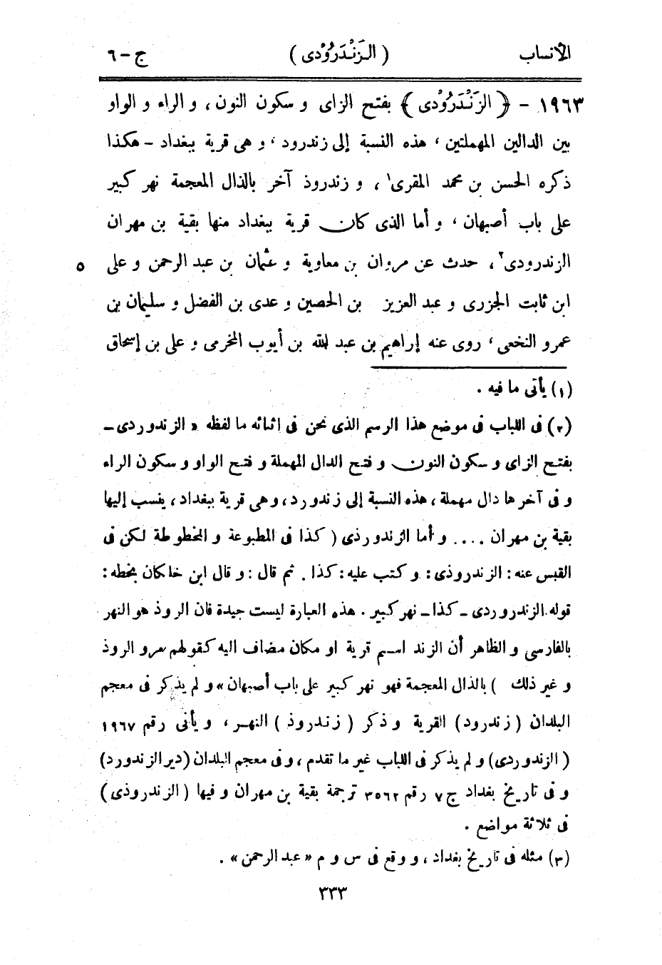 قوله الزندرودي- كذا- نهر كبير. هذه العبارة ليست جيدة فان الروذ هو النهر بالفارسي والظاهر أن الزند اسم قرية أو مكان مضاف اليه كقولهم مروالروذ وغير ذلك) بالذال المعجمة فهو نهر كبير على باب أصبهان» ولم يذكر في معجم البلدان (زندرود) القرية وذكر (زندروذ) النهر، ويأتى رقم 1967 (الزندوردى) ولم يذكر في اللباب غير ما تقدم، وفي معجم البلدان (دير الزندورد) وفي تاريخ بغداد ج 7 رقم 3562 ترجمة بقية بن مهران وفيها (الزندروذى) في ثلاثة مواضع.