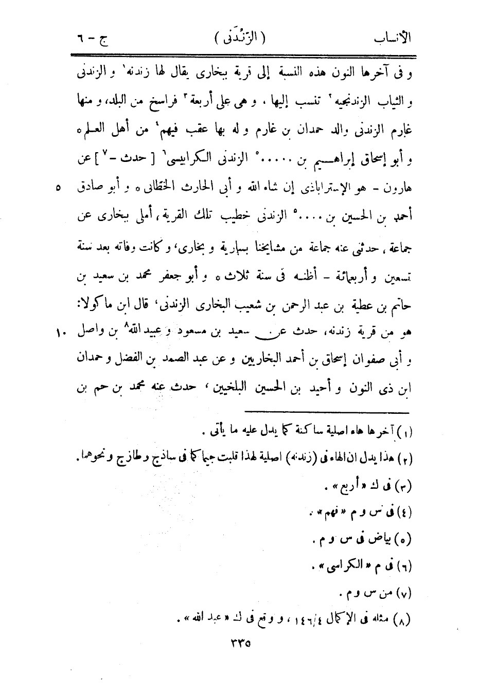 وفي آخرها النون هذه النسبة إلى قرية ببخارى يقال لها زندنه [1] والزندنى والثياب الزندنجيه [2] تنسب إليها، وهي على أربعة [3] فراسخ من البلد، ومنها غارم الزندنى والد حمدان بن غارم وله بها عقب فيهم [4] من أهل العلم وأبو إسحاق إبراهيم بن..... [5] الزندنى الكرابيسي [6] [حدث-[7]] عن هارون- هو الأستراباذي إن شاء الله وأبى الحارث الخطّابي وأبو صادق أحمد بن الحسين بن.... [5] الزندنى خطيب تلك القرية، أملى ببخارى عن جماعة، حدثني عنه جماعة من مشايخنا بسارية وبخارى، وكانت وفاته بعد سنة تسعين وأربعمائة- أظنه في سنة ثلاث وأبو جعفر محمد بن سعيد بن حاتم بن عطية بن عبد الرحمن بن شعيب البخاري الزندنى، قال ابن ماكولا: