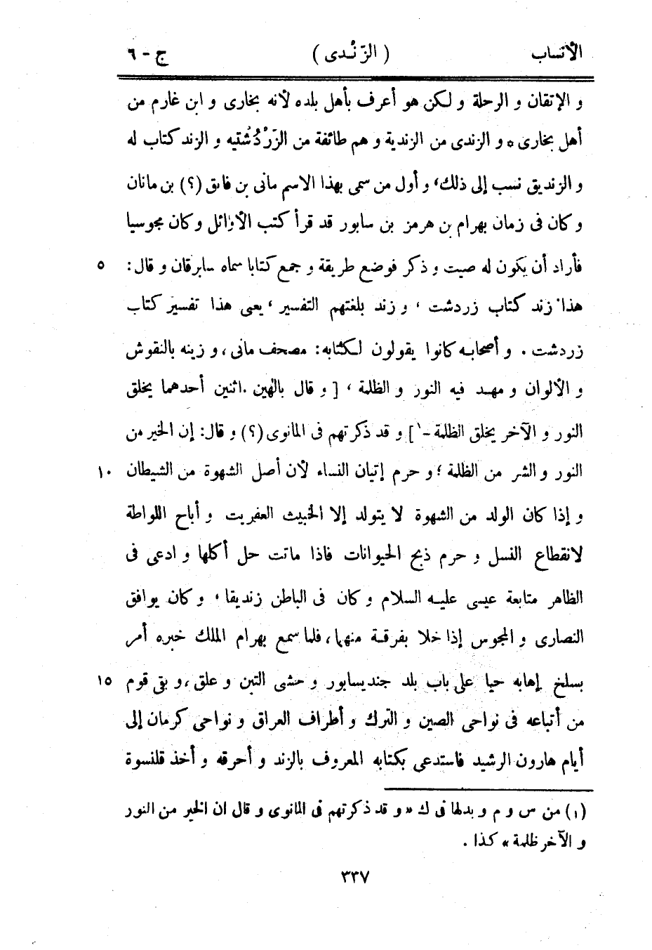 والإتقان والرحلة ولكن هو أعرف بأهل بلده لأنه بخارى وابن غارم من أهل بخارى والزندى من الزندية وهم طائفة من الزردشتيه والزند كتاب له والزنديق نسب إلى ذلك، وأول من سمى بهذا الاسم مانى بن فائق (؟) بن مانان وكان في زمان بهرام بن هرمز بن سابور قد قرأ كتب الأوائل وكان مجوسيا فأراد أن يكون له صيت وذكر فوضع طريقة وجمع كتابا سماه سابرقان وقال:
