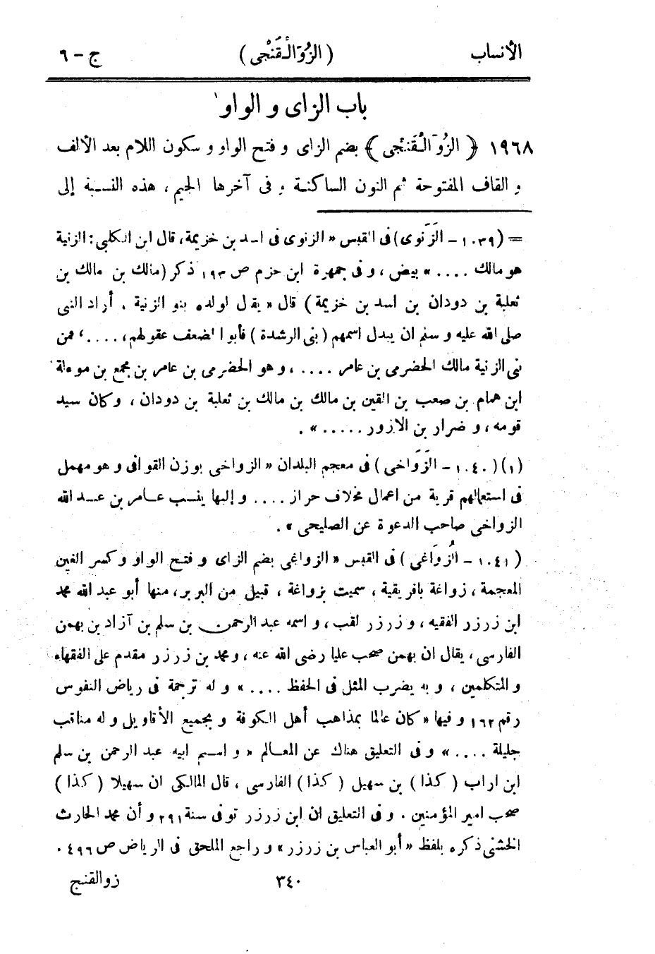 [ () ] (1039- الزنوى) في القبس «الزنوى في أسد بن خزيمة، قال ابن الكلبي: الزنية هو مالك....» بيض، وفي جمهرة ابن حزم ص 193 ذكر (مالك بن مالك بن ثعلبة بن دودان بن أسد بن خزيمة) قال «يقال لولده بنو الزنية، أراد النبي صلى الله عليه وسلم ان يبدل اسمهم (بنى الرشدة) فأبوا لضعف عقولهم،.....، فمن بنى الزنية مالك الحضرميّ بن عامر....، وهو الحضرميّ بن عامر بن مجمع بن موءلة ابن همام بن صعب بن القين بن مالك بن مالك بن ثعلبة بن دودان، وكان سيد قومه، وضرار بن الأزور.....» .