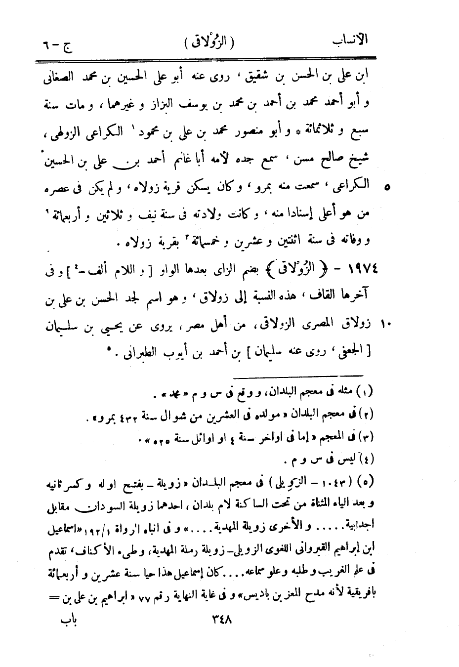 بضم الزاى بعدها الواو [واللام ألف-[4]] وفي آخرها القاف، هذه النسبة إلى زولاق، وهو اسم لجد الحسن بن على بن زولاق المصري الزولاقى، من أهل مصر، يروى عن يحيى بن سليمان [الجعفي، روى عنه سليمان] بن أحمد بن أيوب الطبراني. [5]