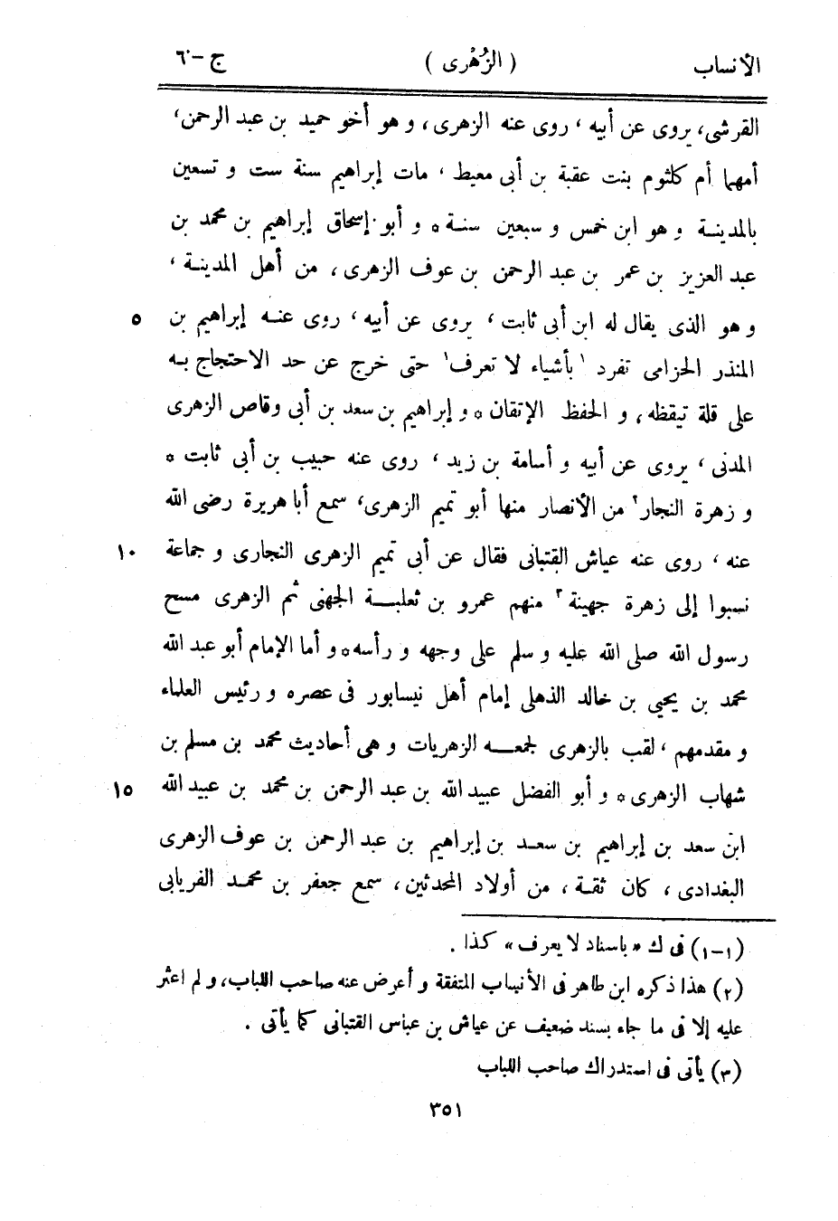 القرشي، يروى عن أبيه، روى عنه الزهري، وهو أخو حميد بن عبد الرحمن، أمهما أم كلثوم بنت عقبة بن أبى معيط، مات إبراهيم سنة ست وتسعين بالمدينة وهو ابن خمس وسبعين سنة وأبو إسحاق إبراهيم بن محمد بن عبد العزيز بن عمر بن عبد الرحمن بن عوف الزهري، من أهل المدينة، وهو الّذي يقال له ابن أبى ثابت، يروى عن أبيه، روى عنه إبراهيم بن المنذر الحزامي تفرد [1] بأشياء لا تعرف [1] حتى خرج عن حد الاحتجاج به على قلة تيقظه، والحفظ الإتقان وإبراهيم بن سعد بن أبى وقاص الزهري المدني، يروى عن أبيه وأسامة بن زيد، روى عنه حبيب بن أبى ثابت وزهرة النجار [2] من الأنصار منها أبو تميم الزهري، سمع أبا هريرة رضى الله عنه، روى عنه عياش القتباني فقال عن أبى تميم الزهري النجاري وجماعة نسبوا إلى زهرة جهينة [3] منهم عمرو بن ثعلبة الجهنيّ ثم الزهري مسح رسول الله صلى الله عليه وسلم على وجهه ورأسه وأما الإمام أبو عبد الله محمد بن يحيى بن خالد الذهلي إمام أهل نيسابور في عصره ورئيس العلماء ومقدمهم، لقب بالزهري لجمعه الزهريات وهي أحاديث محمد بن مسلم بن شهاب الزهري وأبو الفضل عبيد الله بن عبد الرحمن بن محمد بن عبيد الله ابن سعد بن إبراهيم بن سعد بن إبراهيم بن عبد الرحمن بن عوف الزهري البغدادي، كان ثقة، من أولاد المحدثين، سمع جعفر بن محمد الفريابي