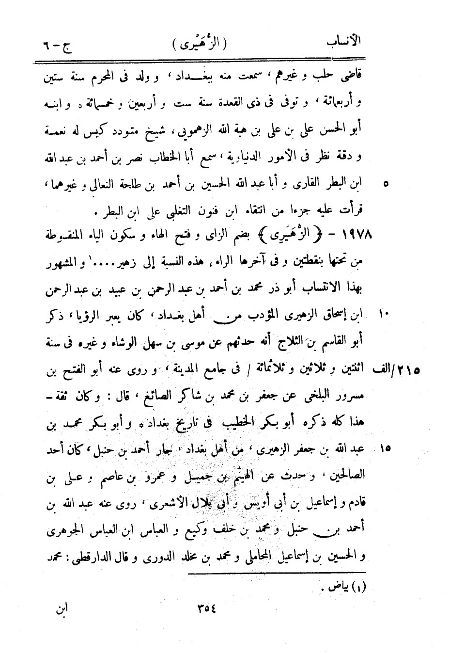 بضم الزاى وفتح الهاء وسكون الياء المنقوطة من تحتها بنقطتين وفي آخرها الراء، هذه النسبة إلى زهير.... [1] والمشهور بهذا الانتساب أبو ذر محمد بن أحمد بن عبد الرحمن بن عبيد بن عبد الرحمن ابن إسحاق الزهيرى المؤدب من أهل بغداد، كان يعبر الرؤيا، ذكر أبو القاسم بن الثلاج أنه حدثهم عن موسى بن سهل الوشاء وغيره في سنة اثنتين وثلاثين وثلاثمائة/ في جامع المدينة، وروى عنه أبو الفتح بن مسرور البلخي عن جعفر بن محمد بن شاكر الصائغ، قال: وكان ثقة- هذا كله ذكره أبو بكر الخطيب في تاريخ بغداد وأبو بكر محمد بن عبد الله بن جعفر الزهيرى، من أهل بغداد، جار أحمد بن حنبل، كان أحد الصالحين، وحدث عن الهيثم بن جميل وعمرو بن عاصم وعلى بن قادم وإسماعيل بن أبى أويس وأبى بلال الأشعري، روى عنه عبد الله بن أحمد بن حنبل ومحمد بن خلف وكيع والعباس ابن العباس الجوهري والحسين بن إسماعيل المحاملي ومحمد بن مخلد الدوري وقال الدار قطنى: محمد