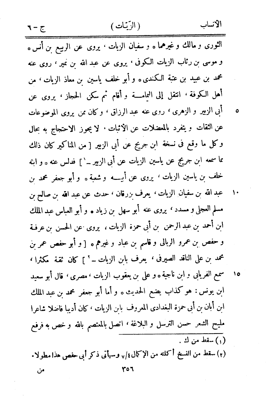 الثوري ومالك وغيرهما وسفيان الزيات، يروى عن الربيع بن أنس وموسى بن رئاب الزيات الكوفي، يروى عن عبد الله بن نمير، روى عنه محمد بن عبيد بن عتبة الكندي وأبو خلف ياسين بن معاذ الزيات، من أهل الكوفة، انتقل إلى اليمامة وأقام ثم سكن الحجاز، يروى عن أبى الزبير والزهري، روى عنه عبد الرزاق، وكان ممن يروى الموضوعات عن الثقات ويتفرد بالمعضلات عن الأثبات، لا يجوز الاحتجاج به بحال وكل ما وقع في نسخة ابن جريج عن أبى الزبير [من المناكير كان ذلك مما سمعه ابن جريج عن ياسين الزيات عن أبى الزبير-[1]] فدلس عنه وابنه خلف بن ياسين الزيات، يروى عن أبيه وشعبة وأبو جعفر محمد بن عبد الله بن سفيان الزيات، يعرف بزرقان، حدث عن عبد الله بن صالح بن مسلم العجليّ ومسدد، يروى عنه أبو سهل بن زياد وأبو العباس عبد الملك ابن أحمد بن عبد الرحمن بن أبى حمزة الزيات، يروى عن الحسن بن عرفة وحفص بن عمرو الربالى وقاسم بن عباد وغيرهم [وأبو حفص عمر بن محمد بن على الناقد الصيرفي، يعرف بابن الزيات-[2]] كان ثقة مكثرا، سمع الفريابي وابن ناجية وعلى بن يعقوب الزيات، مصرى، قال أبو سعيد ابن يونس: هو كذاب يضع الحديث وأما أبو جعفر محمد بن عبد الملك ابن أبان بن أبى حمزة البغدادي المعروف بابن الزيات، كان أديبا فاضلا شاعرا مليح الشعر حسن الترسل والبلاغة، اتصل بالمعتصم باللَّه وخص به فرفع