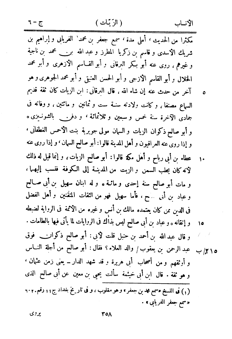 مكثرا من الحديث، أملى مدة، سمع جعفر بن محمد [1] الفريابي وإبراهيم بن شريك الأسدي وقاسم بن زكريا المطرز وعبد الله بن محمد بن ناجية وغيرهم، روى عنه أبو بكر البرقاني وأبو القاسم الأزهري وأبو محمد الخلال وأبو القاسم الأزجي وأبو الحسن العتيقى وأبو محمد الجوهري وهو آخر من حدث عنه إن شاء الله، قال البرقاني: ابن الزيات كان ثقة قديم السماع مصنفا، وكانت ولادته سنة ست وثمانين ومائتين، ووفاته في جمادى الآخرة سنة خمس وسبعين وثلاثمائة، ودفن بالشونيزي وأبو صالح ذكوان الزيات والسمان مولى جويرية بنت الأحمس الغطفانيّ، وإذا روى عنه العراقيون وأهل المدينة قالوا: أبو صالح السمان، وإذا روى عنه عطاء بن أبى رباح وأهل مكة قالوا: أبو صالح الزيات، وإنما قيل له ذلك لأنه كان يجلب السمن والزيت من المدينة إلى الكوفة فنسب إليهما، ومات أبو صالح سنة إحدى ومائة وله ابنان سهيل بن أبى صالح وعباد بن أبى صالح، فأما سهيل فهو من الثقات المتقنين وأهل الفضل في الدين ممن كان يعتمده مالك بن أنس وغيره من الأئمة في الرواية لضبطه وإتقانه وعباد بن أبى صالح ليس بذاك في الروايات لما يأتى فيها بالطامات.