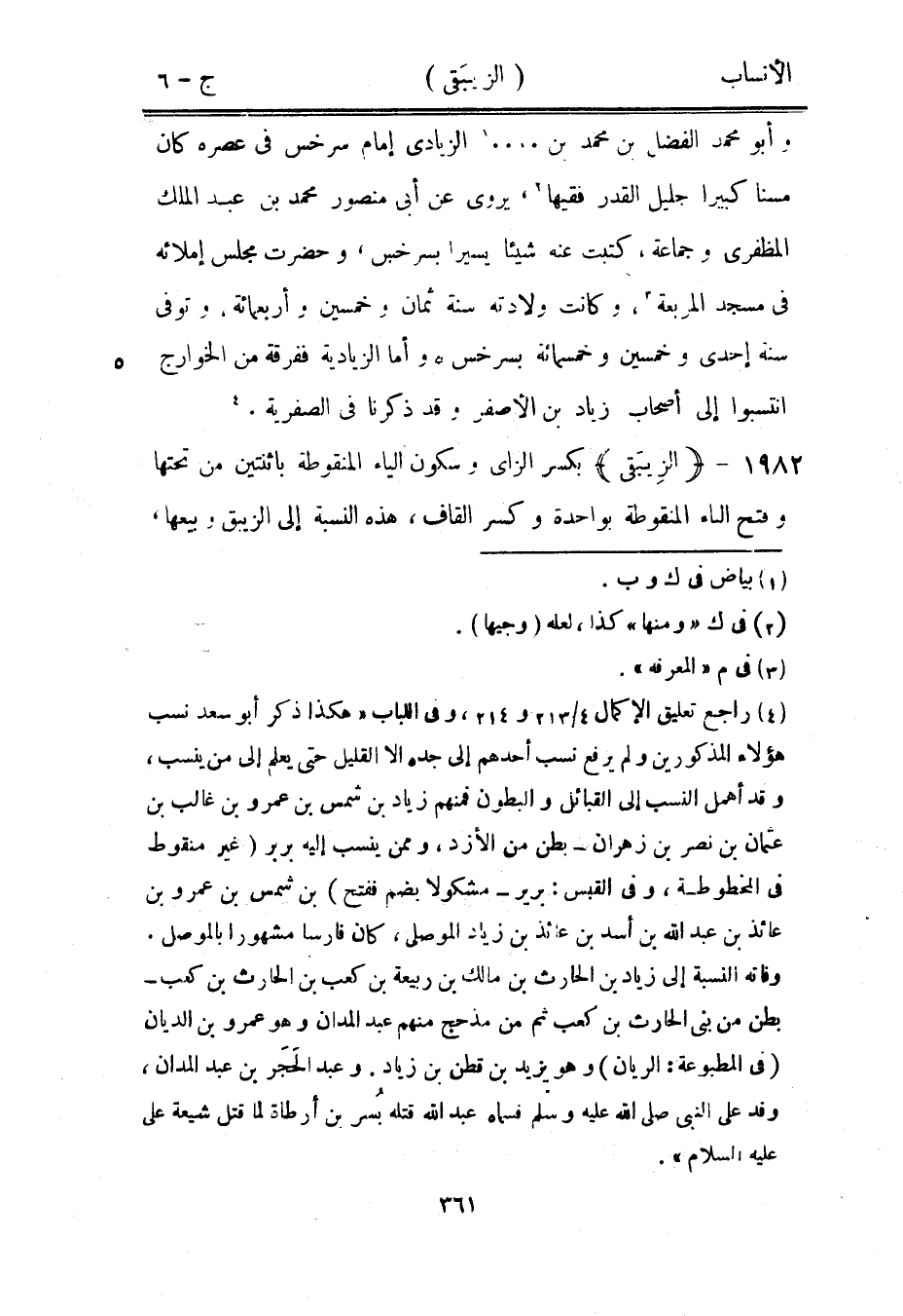 [4] راجع تعليق الإكمال 4/ 213 و 214، وفي اللباب «هكذا ذكر أبو سعد نسب هؤلاء المذكورين ولم يرفع نسب أحدهم إلى جده الا القليل حتى يعلم إلى من ينسب، وقد أهمل النسب إلى القبائل والبطون فمنهم زياد بن شمس بن عمرو بن غالب بن عثمان بن نصر بن زهران- بطن من الأزد، وممن ينسب إليه بربر (غير منقوط في المخطوطة، وفي القبس: برير- مشكولا بضم ففتح) بن شمس بن عمرو بن عائذ بن عبد الله بن أسد بن عائذ بن زياد الموصلي، كان فارسا مشهورا بالموصل.