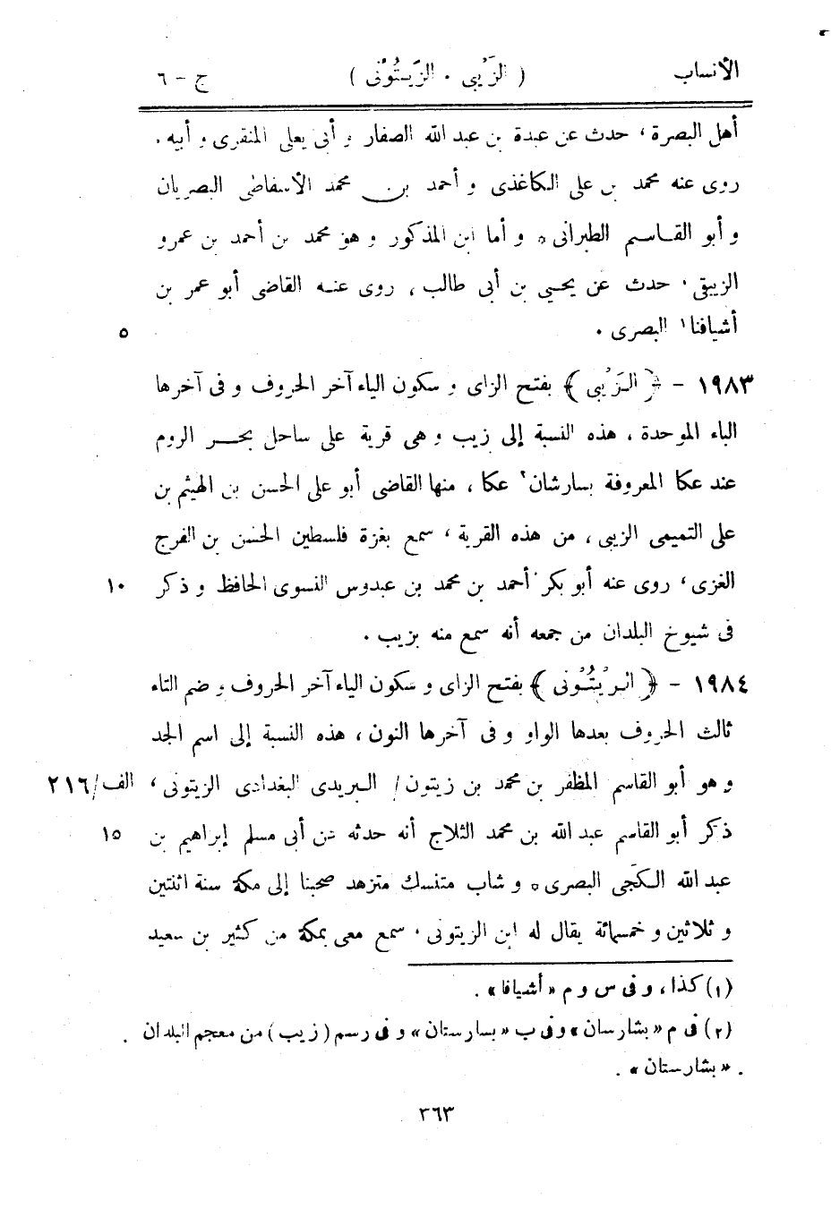 بفتح الزاى وسكون الياء آخر الحروف وفي آخرها الباء الموحدة، هذه النسبة إلى زيب وهي قرية على ساحل بحر الروم عند عكا المعروفة بسارشان [2] عكا، منها القاضي أبو على الحسن بن الهيثم بن على التميمي الزيبى، من هذه القرية، سمع بغزة فلسطين الحسن بن الفرج الغزى، روى عنه أبو بكر أحمد بن محمد بن عبدوس النسوي الحافظ وذكر في شيوخ البلدان من جمعه أنه سمع منه بزيب.