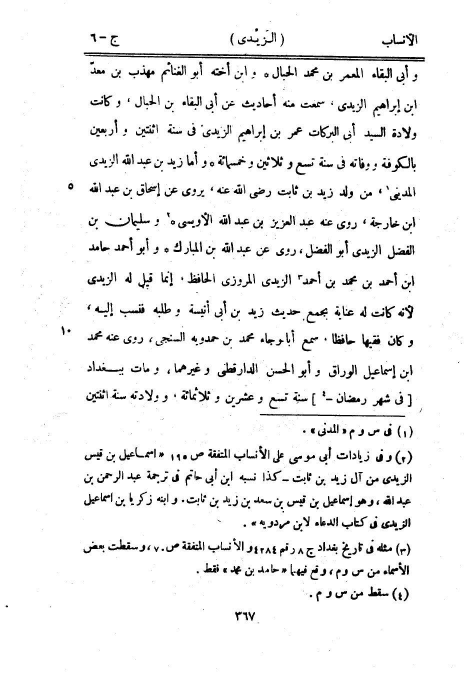 وأبى البقاء المعمر بن محمد الحبال وابن أخته أبو الغنائم مهذب بن معدّ ابن إبراهيم الزيدي، سمعت منه أحاديث عن أبى البقاء بن الحبال، وكانت ولادة السيد أبى البركات عمر بن إبراهيم الزيدي في سنة اثنتين وأربعين بالكوفة ووفاته في سنة تسع وثلاثين وخمسمائة وأما زيد بن عبد الله الزيدي المديني [1] ، من ولد زيد بن ثابت رضي الله عنه، يروى عن إسحاق بن عبد الله ابن خارجة، روى عنه عبد العزيز بن عبد الله الأويسي [2] وسليمان بن الفضل الزيدي أبو الفضل، روى عن عبد الله بن المبارك وأبو أحمد حامد ابن أحمد بن محمد بن أحمد [3] الزيدي المروزي الحافظ، إنما قيل له الزيدي لأنه كانت له عناية بجمع حديث زيد بن أبى أنيسة وطلبه فنسب إليه، وكان فقيها حافظا، سمع أبا وجاء محمد بن حمدويه السنجى، روى عنه محمد ابن إسماعيل الوراق وأبو الحسن الدار قطنى وغيرهما، ومات ببغداد [في شهر رمضان-[4]] سنة تسع وعشرين وثلاثمائة، وولادته سنة اثنتين