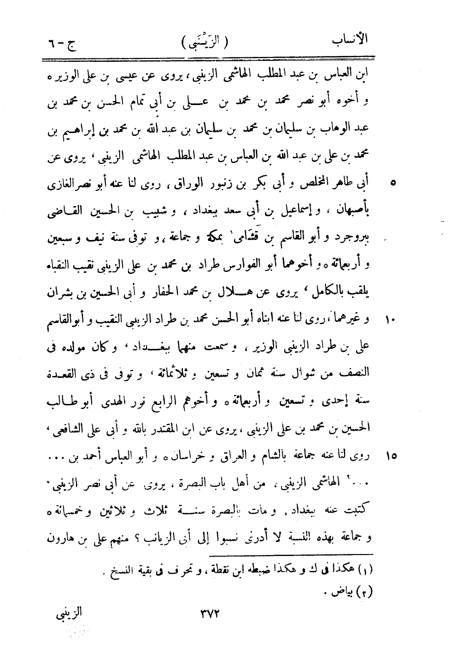 ابن العباس بن عبد المطلب الهاشمي الزينبي، يروى عن عيسى بن على الوزير وأخوه أبو نصر محمد بن محمد بن على بن أبى تمام الحسن بن محمد بن عبد الوهاب بن سليمان بن محمد بن سليمان بن عبد الله بن محمد بن إبراهيم بن محمد بن على بن عبد الله بن العباس بن عبد المطلب الهاشمي الزينبي، يروى عن أبى طاهر المخلص وأبى بكر بن زنبور الوراق، روى لنا عنه أبو نصر الغازي بأصبهان، وإسماعيل بن أبى سعد ببغداد، وشبيب بن الحسين القاضي ببروجرد وأبو القاسم بن قشامى [1] بمكة وجماعة، وتوفى سنة نيف وسبعين وأربعمائة وأخوهما أبو الفوارس طراد بن محمد بن على الزينبي نقيب النقباء يلقب بالكامل، يروى عن هلال بن محمد الحفار وأبى الحسين بن بشران وغيرهما، روى لنا عنه ابناه أبو الحسن محمد بن طراد الزينبي النقيب وأبو القاسم على بن طراد الزينبي الوزير، وسمعت منهما ببغداد، وكان مولده في النصف من شوال سنة ثمان وتسعين وثلاثمائة، وتوفى في ذي القعدة سنة إحدى وتسعين وأربعمائة وأخوهم الرابع نور الهدى أبو طالب الحسين بن محمد بن على الزينبي، يروى عن ابن المقتدر باللَّه وأبى على الشافعيّ، روى لنا عنه جماعة بالشام والعراق وخراسان وأبو العباس أحمد بن ...