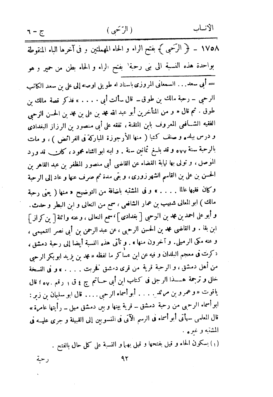 [ () ] أبى سعد ... السمعاني المروزي باسناد له طويل أوصله إلى على بن سعد الكاتب الرحبيّ- رحبة مالك بن طوق- قال سألت أبى....» فذكر قصة مالك بن طوق. ثم قال «ومن المتأخرين أبو عبد الله محمد بن على بن محمد بن الحسن الزحبى الفقيه الشافعيّ المعروف بابن المتقنة، تفقه على أبى منصور بن الرزاز البغدادي ودرس ببلده وصنف كتبا (منها الأرجوزة المباركة في الفرائض) ، ومات بالرحبة سنة 577 وقد بلغ ثمانين سنة. وابنه ابو الثناء محمود، كان قد ورد الموصل، وتولى بها نيابة القضاء عن القاضي أبى منصور المظفر بن عبد القاهر بن الحسن بن على بن القاسم الشهرزوري، وبقي مدة ثم صرف عنها وعاد إلى الرحبة وكان فقيها عالما....» وفي المشتبه بإضافة من التوضيح «منها (يعنى رحبة مالك) ابو المعالي شبيب بن عمار الشافعيّ، سمع من النعالى وابن البطر وحدث.