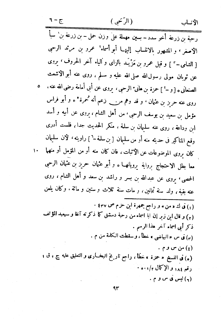 رحبة بن زرعة أخو سدد- بسين مهملة على وزن حمل- بن زرعة بن [1] سبإ الأصغر، والمشهور بالانتساب إليها أبو أسماء [2] عمرو بن مرثد الرحبيّ [الشامي-[3]] وقيل عمرو بن مزيد بالزاي والياء آخر الحروف، يروى عن ثوبان مولى رسول الله صلى الله عليه وسلم، روى عنه أبو الأشعث الصنعاني [و-[4]] حمزة بن هانئ الرحبيّ، يروى عن أبى أمامة رضي الله عنه، روى عنه حريز بن عثمان، وقد وهم من زعم أنه حمرة [5] وأبو فراس مؤمل بن سعيد بن يوسف الرحبيّ، من أهل الشام، يروى عن أبيه وأسد ابن وداعة، روى عنه سليمان بن سلمة، منكر الحديث جدا، فلست أدرى وقع المناكير في حديثه منه أو من سليمان [بن سلمة-[6]] راويته، لأن سليمان كان يروى الموضوعات عن الأثبات، فان كان منه أو من المؤمل أو منهما معا بطل الاحتجاج برواية يرويانها وأبو عثمان حريز بن عثمان الرحبيّ الحمصي، يروى عن عبد الله بن بسر وراشد بن سعد وأهل الشام، روى عنه بقية، ولد سنة ثمانين، ومات سنة ثلاث وستين ومائة، وكان يلعن