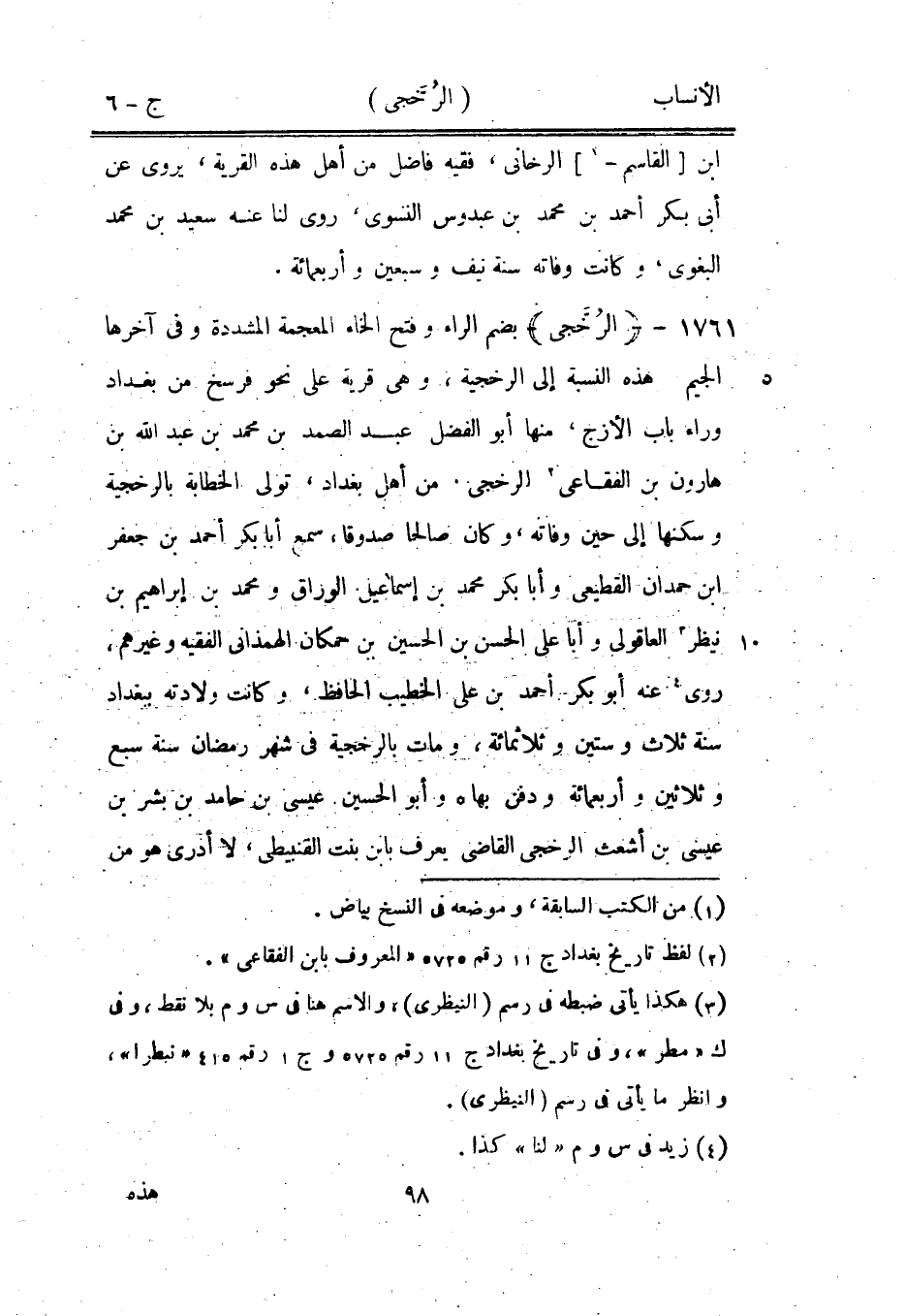بضم الراء وفتح الخاء المعجمة المشددة وفي آخرها الجيم هذه النسبة إلى الرخجية، وهي قرية على نحو فرسخ من بغداد وراء باب الأزج، منها أبو الفضل عبد الصمد بن محمد بن عبد الله بن هارون بن الفقاعى [2] الرخجي، من أهل بغداد، تولى الخطابة بالرخجية وسكنها إلى حين وفاته، وكان صالحا صدوقا، سمع أبا بكر أحمد بن جعفر ابن حمدان القطيعي وأبا بكر محمد بن إسماعيل الوراق ومحمد بن إبراهيم بن نيظر [3] العاقولي وأبا على الحسن بن الحسين بن حمكان الهمذانيّ الفقيه وغيرهم، روى [4] عنه أبو بكر أحمد بن على الخطيب الحافظ، وكانت ولادته ببغداد سنة ثلاث وستين وثلاثمائة، ومات بالرخجية في شهر رمضان سنة سبع وثلاثين وأربعمائة ودفن بها وأبو الحسين عيسى بن حامد بن بشر بن عيسى بن أشعث الرخجي القاضي يعرف بابن بنت القنبيطي، لا أدرى هو من