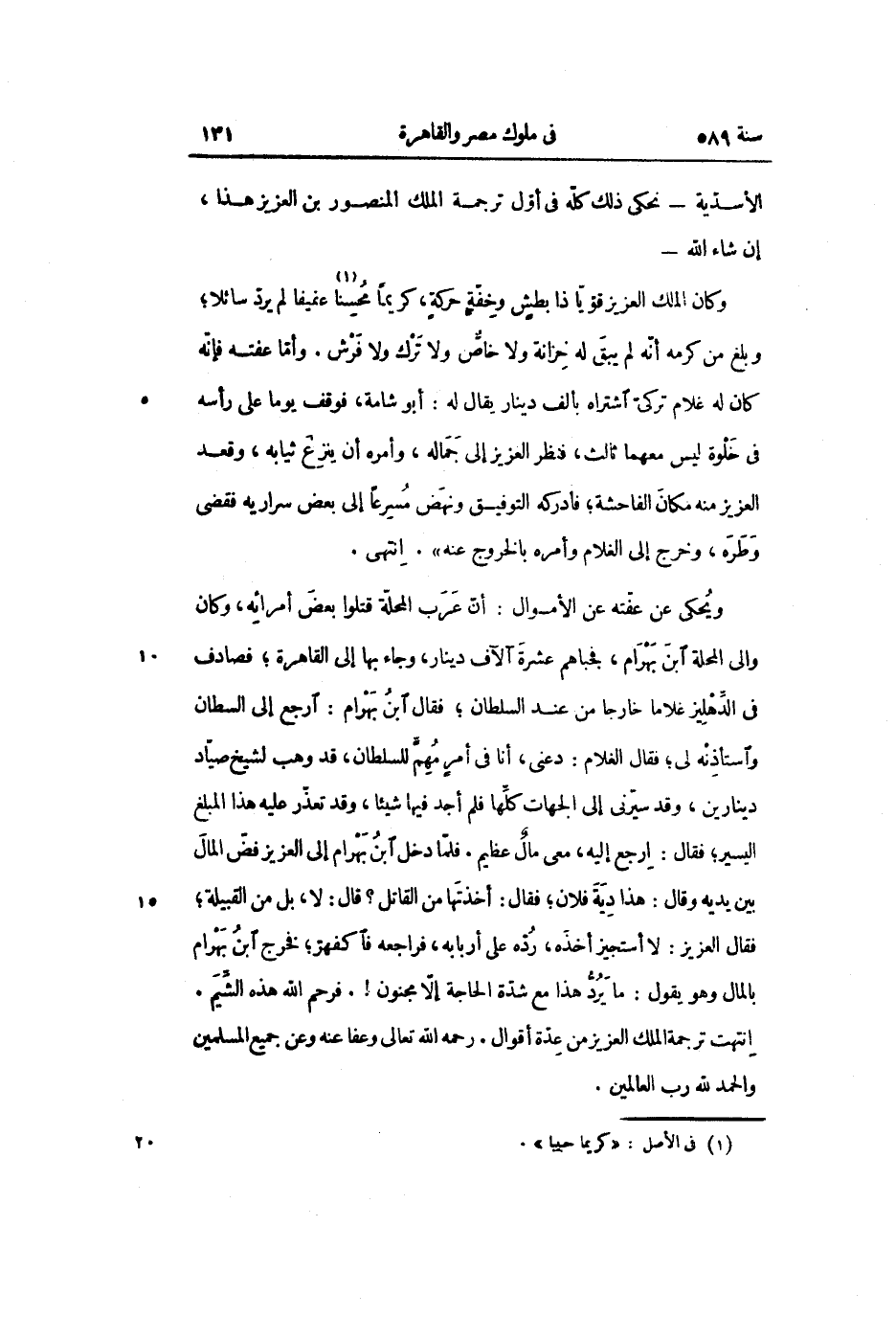 ويحكى عن عفّته عن الأموال: أنّ عرب المحلّة قتلوا بعض أمرائه، وكان والى المحلة ابن بهرام، فجباهم عشرة آلاف دينار، وجاء بها إلى القاهرة؛ فصادف فى الدّهليز غلاما خارجا من عند السلطان؛ فقال ابن بهرام: ارجع إلى السلطان واستأذنه لى؛ فقال الغلام: دعنى، أنا فى أمر مهمّ للسلطان، قد وهب لشيخ صيّاد دينارين، وقد سيّرنى إلى الجهات كلّها فلم أجد فيها شيئا، وقد تعذّر عليه هذا المبلغ اليسير؛ فقال: ارجع إليه، معى مال عظيم. فلمّا دخل ابن بهرام إلى العزيز فضّ المال بين يديه وقال: هذا دية فلان؛ فقال: أخذتها من القاتل؟ قال: لا، بل من القبيلة؛ فقال العزيز: لا أستجيز أخذه، ردّه على أربابه، فراجعه فاكفهرّ؛ فخرج ابن بهرام بالمال وهو يقول: ما يردّ هذا مع شدّة الحاجة إلّا مجنون!. فرحم الله هذه الشّيم.