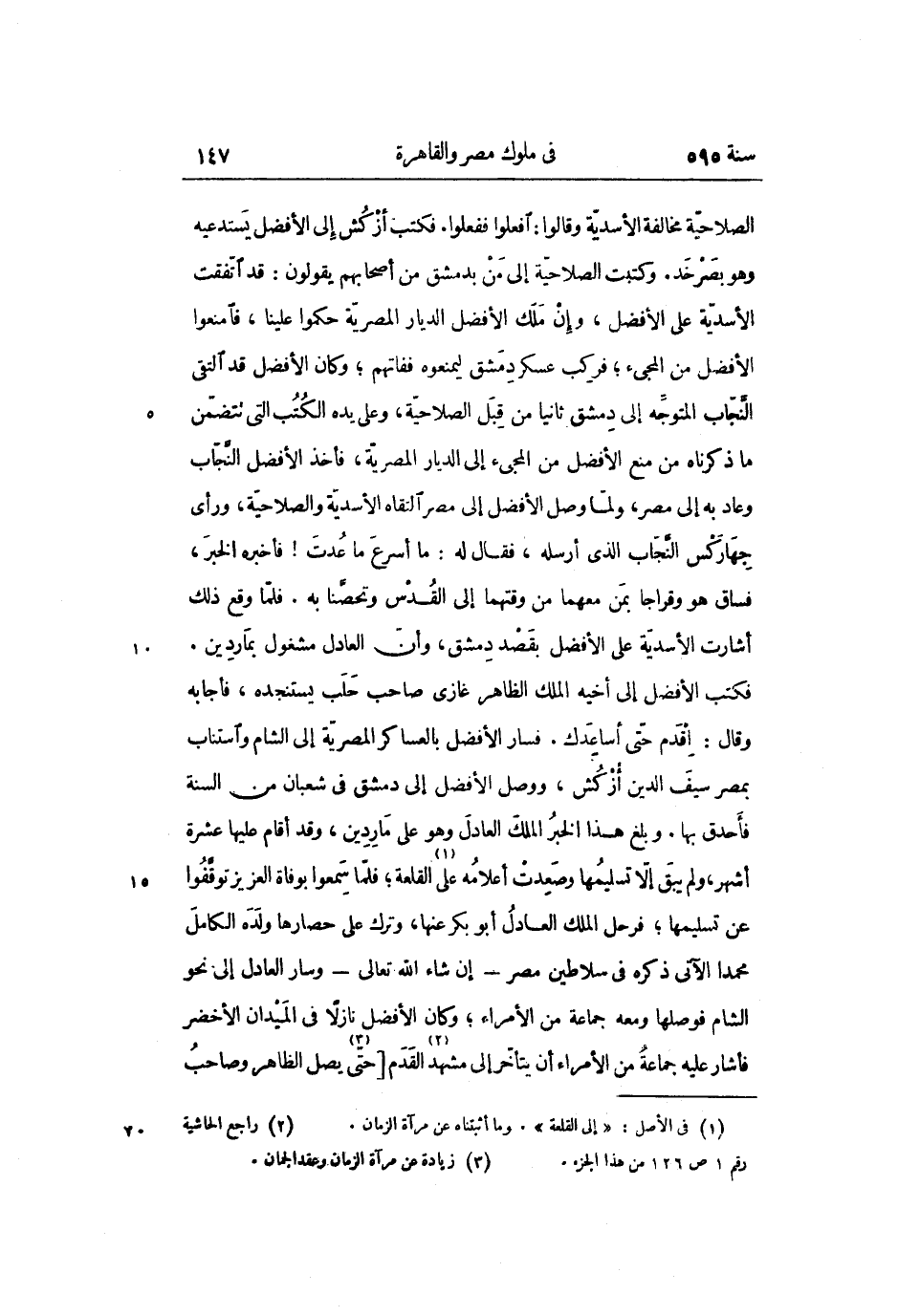 الصلاحيّة مخالفة الأسديّة وقالوا: افعلوا ففعلوا. فكتب أزكش إلى الأفضل يستدعيه وهو بصرخد. وكتبت الصلاحيّة إلى من بدمشق من أصحابهم يقولون: قد اتّفقت الأسديّة على الأفضل، وإن ملك الأفضل الديار المصريّة حكموا علينا، فامنعوا الأفضل من المجىء؛ فركب عسكر دمشق ليمنعوه ففاتهم؛ وكان الأفضل قد التقى النّجّاب المتوجّه إلى دمشق ثانيا من قبل الصلاحيّة، وعلى يده الكتب التى تتضمّن ما ذكرناه من منع الأفضل من المجىء إلى الديار المصريّة، فأخذ الأفضل النّجّاب وعاد به إلى مصر، ولمّا وصل الأفضل إلى مصر التقاه الأسديّة والصلاحيّة، ورأى جهاركس النّجّاب الذي أرسله، فقال له: ما أسرع ما عدت! فأخبره الخبر، فساق هو وقراجا بمن معهما من وقتهما إلى القدس وتحصّنا به. فلمّا وقع ذلك أشارت الأسديّة على الأفضل بقصد دمشق، وأنّ العادل مشغول بماردين.