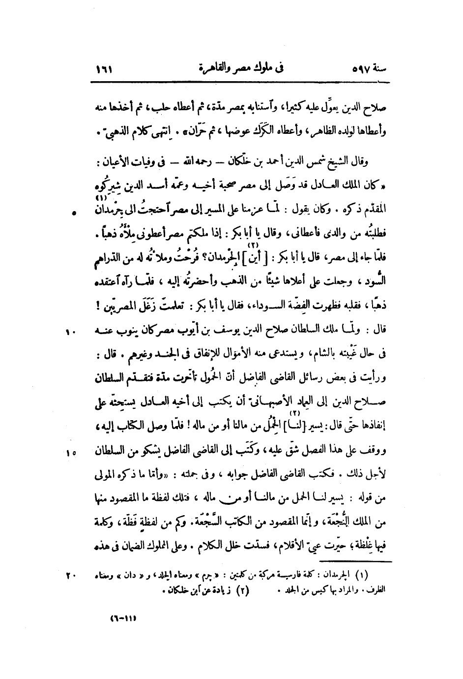 فلمّا جاء إلى مصر، قال يا أبا بكر: [أين «2» ] الجرمدان؟ فرحت وملأته له من الدّراهم السّود، وجعلت على أعلاها شيئا من الذهب وأحضرته إليه، فلمّا رآه اعتقده ذهبا، فقلبه فظهرت الفضّة السوداء، فقال يا أبا بكر: تعلمت زغل المصريّين! قال: ولمّا ملك السلطان صلاح الدين يوسف بن أيّوب مصر كان ينوب عنه فى حال غيبته بالشام، ويستدعى منه الأموال للإنفاق فى الجند وغيرهم. قال: