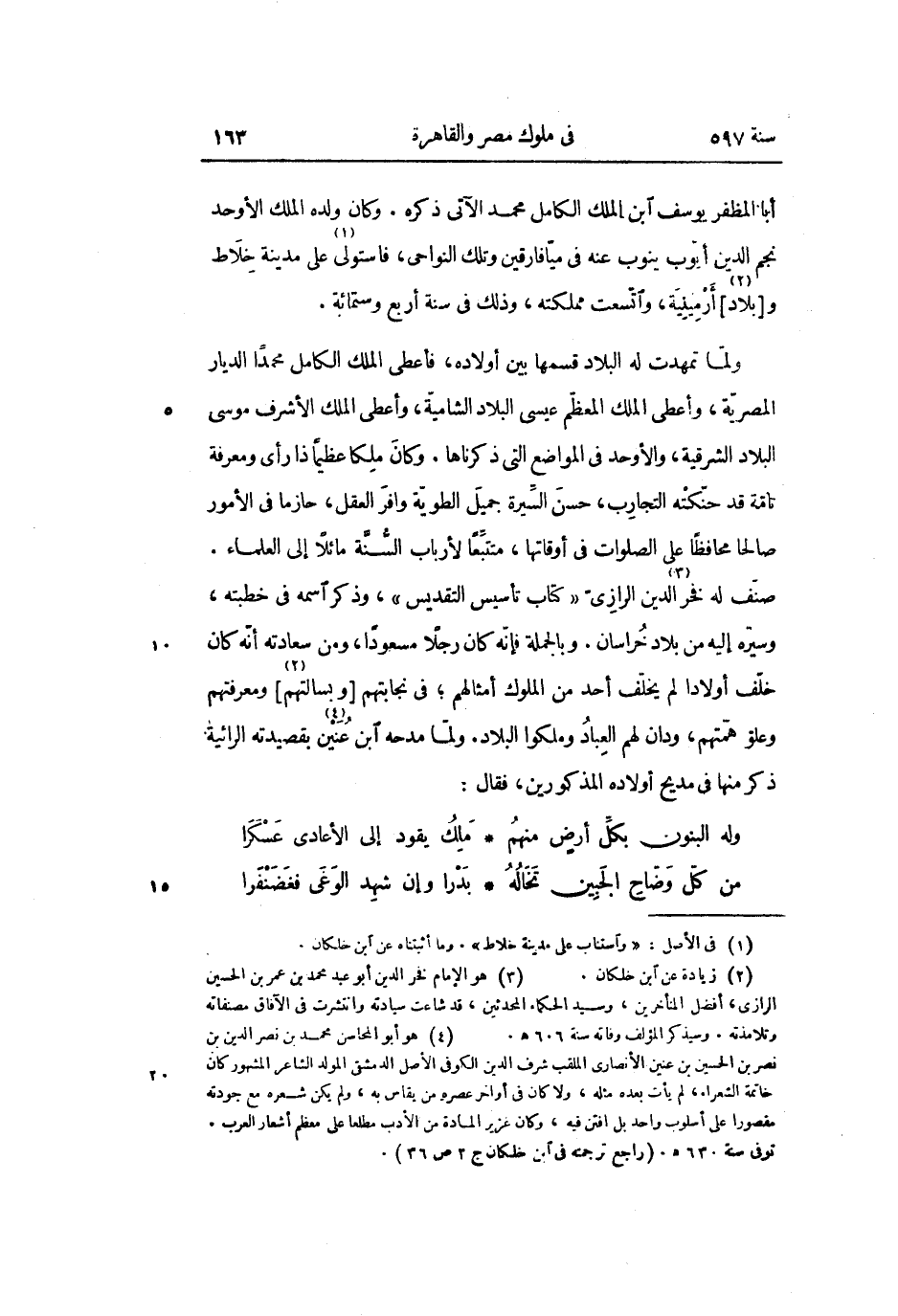 صنّف له فخر الدين «3» الرازىّ «كتاب تأسيس التقديس» ، وذكر اسمه فى خطبته، وسيره إليه من بلاد خراسان. وبالجملة فإنّه كان رجلا مسعودا، ومن سعادته أنّه كان خلّف أولادا لم يخلّف أحد من الملوك أمثالهم؛ فى نجابتهم [وبسالتهم «4» ] ومعرفتهم وعلوّ همّتهم، ودان لهم العباد وملكوا البلاد. ولمّا مدحه ابن عنين «5» بقصيدته الرائية ذكر منها فى مديح أولاده المذكورين، فقال: