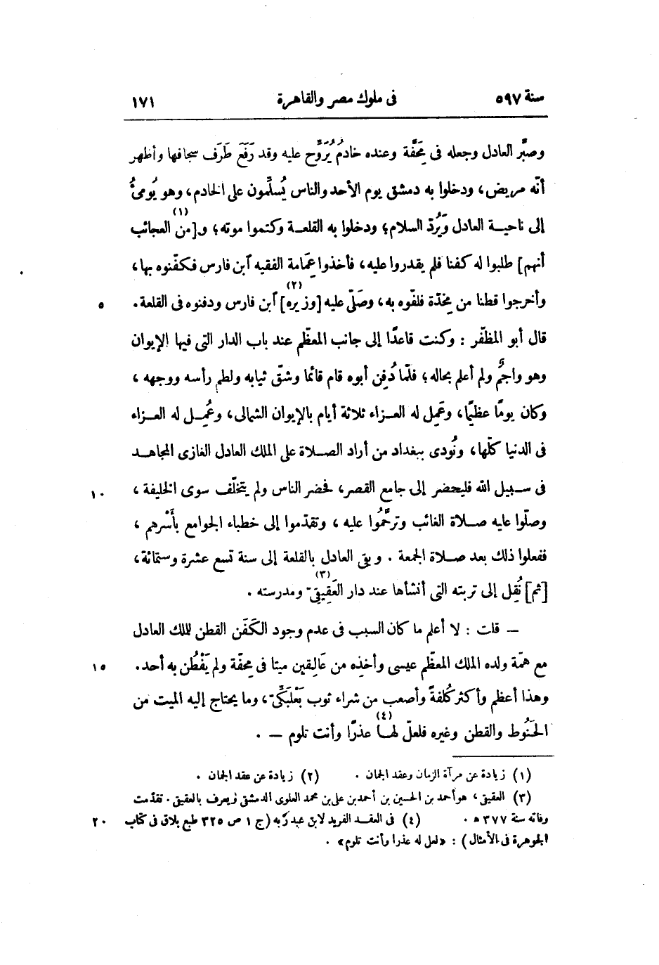 - قلت: لا أعلم ما كان السبب فى عدم وجود الكفن القطن للملك العادل مع همة ولده الملك المعظّم عيسى وأخذه من عالقين ميتا فى محفّة ولم يفطن به أحد.
