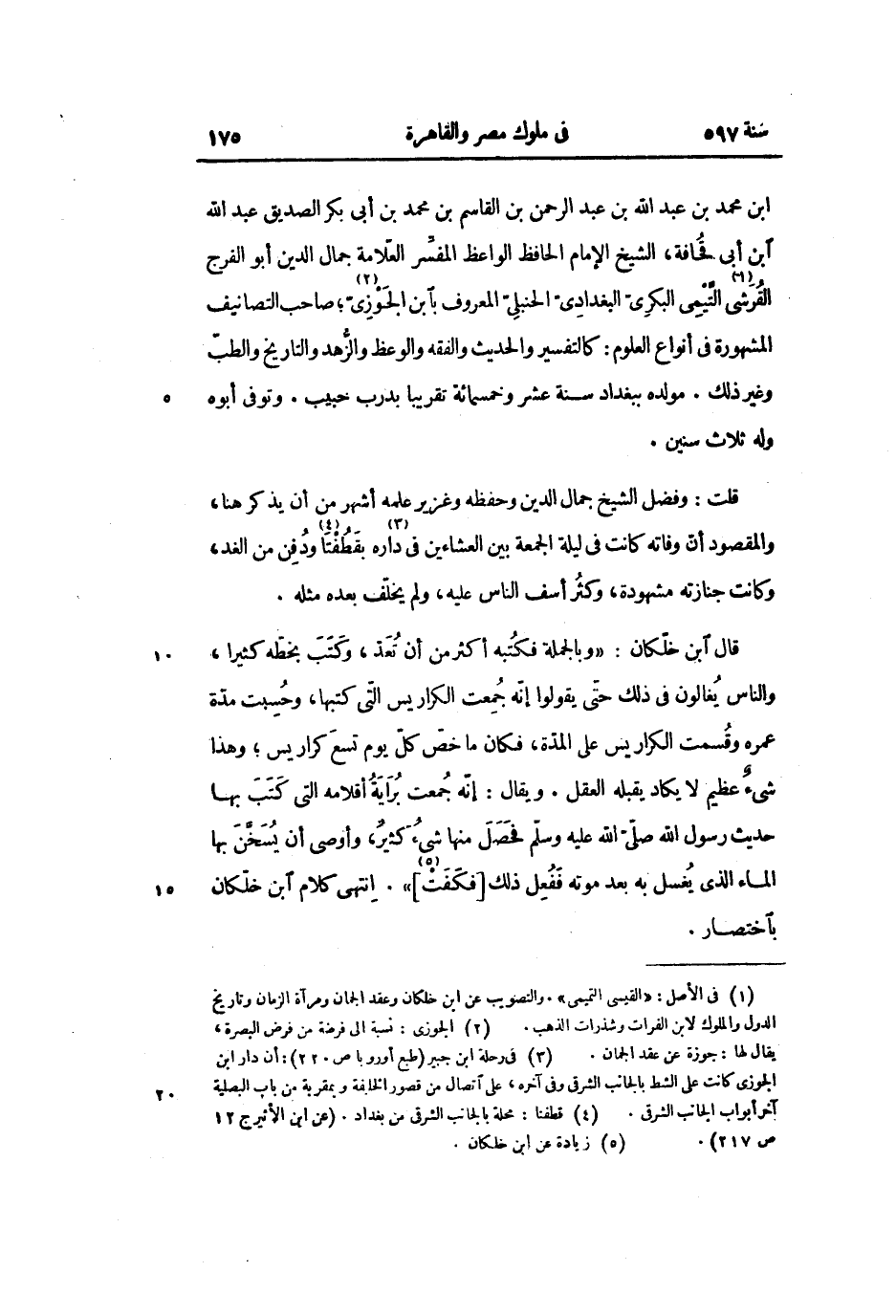 ابن محمد بن عبد الله بن عبد الرحمن بن القاسم بن محمد بن أبى بكر الصديق عبد الله ابن أبى قحافة، الشيخ الإمام الحافظ الواعظ المفسّر العلّامة جمال الدين أبو الفرج القرشى «1» التّيمى البكرىّ البغدادىّ الحنبلىّ المعروف بابن الجوزىّ «2» ؛ صاحب التصانيف المشهورة فى أنواع العلوم: كالتفسير والحديث والفقه والوعظ والزّهد والتاريخ والطبّ وغير ذلك. مولده ببغداد سنة عشر وخمسمائة تقريبا بدرب حبيب. وتوفى أبوه وله ثلاث سنين.
