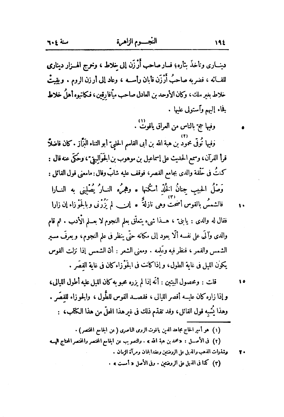 فقال له والدى: يا بنىّ، هذا شىء يتعلّق بعلم النجوم لا بعلم الأدب. ثم قام والدى وآلى على نفسه ألّا يعود إلى مكانه حتّى ينظر فى علم النجوم، ويعرف مسير الشمس والقمر، فنظر فيه وعلمه. ومعنى الشعر: أنّ الشمس إذا نزلت القوس يكون الليل فى غاية الطول، وإذا كانت فى الجوزاء كان فى غاية القصر.