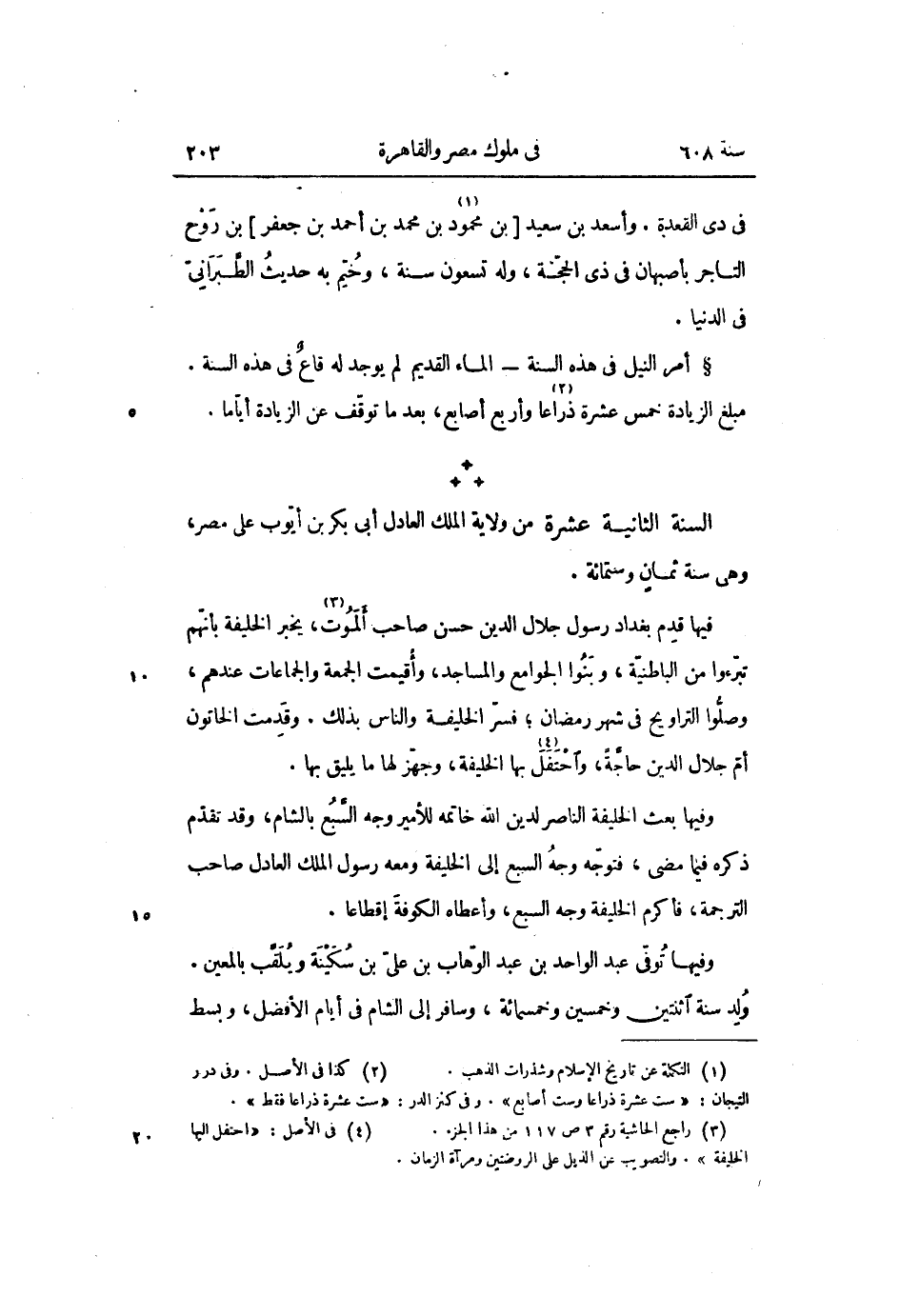 فيها قدم بغداد رسول جلال الدين حسن صاحب ألموت «3» ، يخبر الخليفة بأنّهم تبرّءوا من الباطنيّة، وبنوا الجوامع والمساجد، وأقيمت الجمعة والجماعات عندهم، وصلّوا التراويح فى شهر رمضان؛ فسرّ الخليفة والناس بذلك. وقدمت الخاتون أمّ جلال الدين حاجّة، واحتفل «4» بها الخليفة، وجهّز لها ما يليق بها.