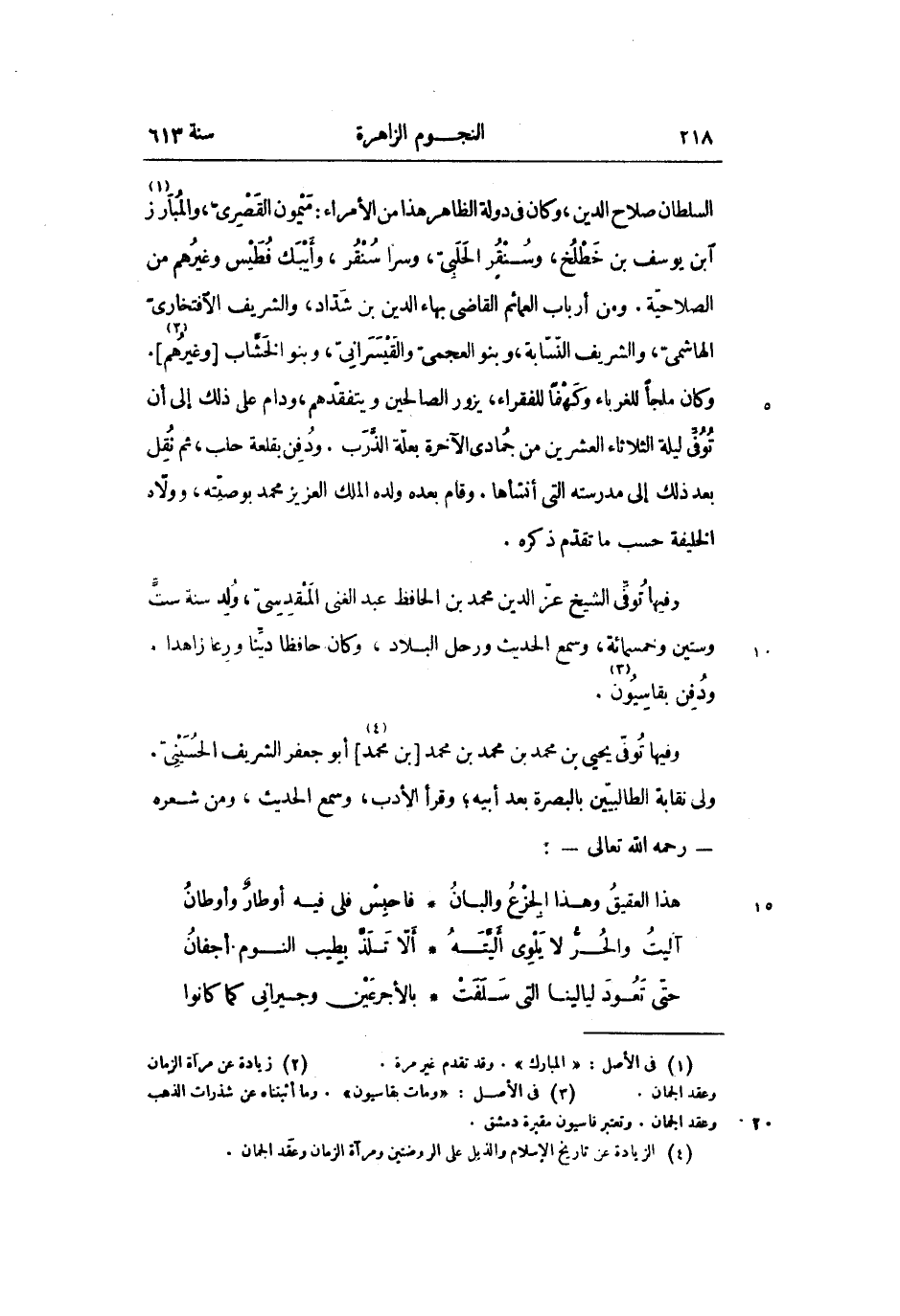 السلطان صلاح الدين، وكان فى دولة الظاهر هذا من الأمراء: ميمون القصرىّ، والمبارز «1» ابن يوسف بن خطلخ، وسنقر الحلبىّ، وسرا سنقر، وأيبك فطيس وغيرهم من الصلاحيّة. ومن أرباب العمائم القاضى بهاء الدين بن شدّاد، والشريف الافتخارىّ الهاشمىّ، والشريف النّسّابة، وبنو العجمىّ والقيسرانىّ، وبنو الخشّاب [وغيرهم «2»