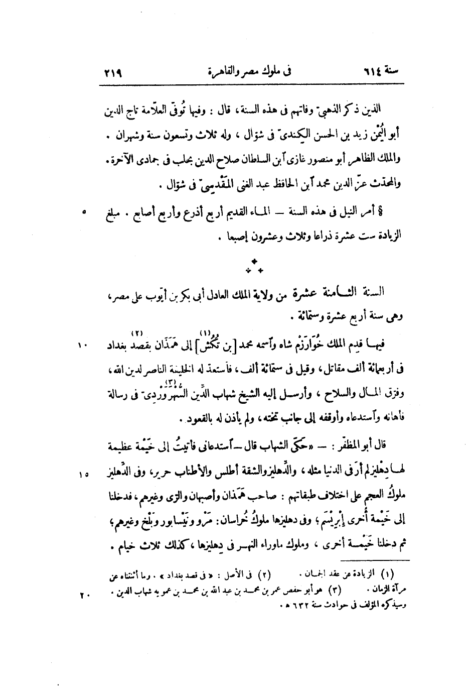 فيها قدم الملك خوارزم شاه واسمه محمد [بن تكش «1» ] إلى همذان بقصد «2» بغداد فى أربعمائة ألف مقاتل، وقيل فى ستمائة ألف، فأستعدّ له الخليفة الناصر لدين الله، وفرّق المال والسلاح، وأرسل إليه الشيخ شهاب الدّين السّهروردىّ «3» فى رسالة فأهانه واستدعاه وأوقفه إلى جانب تخته، ولم يأذن له بالقعود.