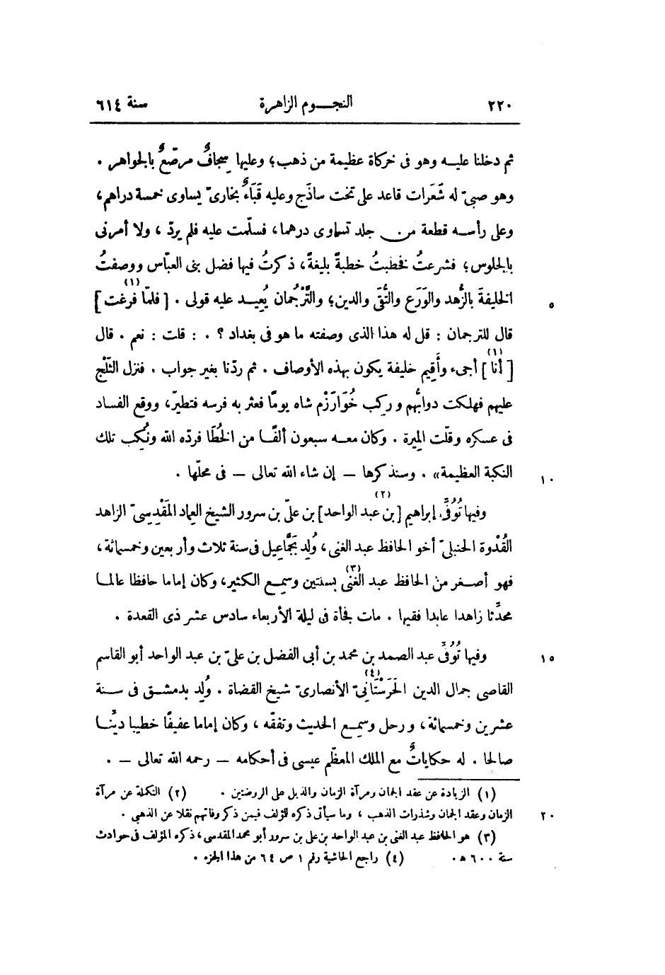 وفيها توفّى إبراهيم [بن «3» عبد الواحد] بن علىّ بن سرور الشيخ العماد المقدسىّ الزاهد القدوة الحنبلىّ أخو الحافظ عبد الغنى، ولد بجمّاعيل فى سنة ثلاث وأربعين وخمسمائة، فهو أصغر من الحافظ عبد الغنى «4» بسنتين وسمع الكثير، وكان إماما حافظا عالما محدّثا زاهدا عابدا فقيها. مات فجأة فى ليلة الأربعاء سادس عشر ذى القعدة.