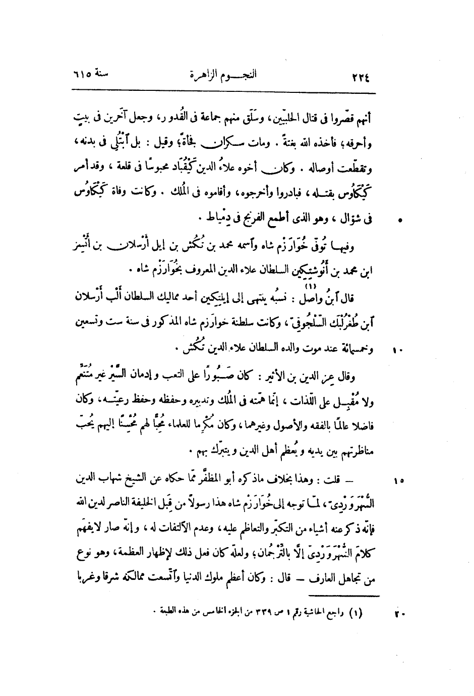 - قلت: وهذا بخلاف ما ذكره أبو المظفّر ممّا حكاه عن الشيخ شهاب الدين السّهروردىّ، لمّا توجه إلى خوارزم شاه هذا رسولا من قبل الخليفة الناصر لدين الله فإنّه ذكر عنه أشياء من التكبّر والتعاظم عليه، وعدم الالتفات له، وإنّه صار لا يفهم كلام السّهروردىّ إلّا بالتّرجمان؛ ولعلّه كان فعل ذلك لإظهار العظمة، وهو نوع من تجاهل العارف- قال: وكان أعظم ملوك الدنيا واتّسعت ممالكه شرقا وغربا
