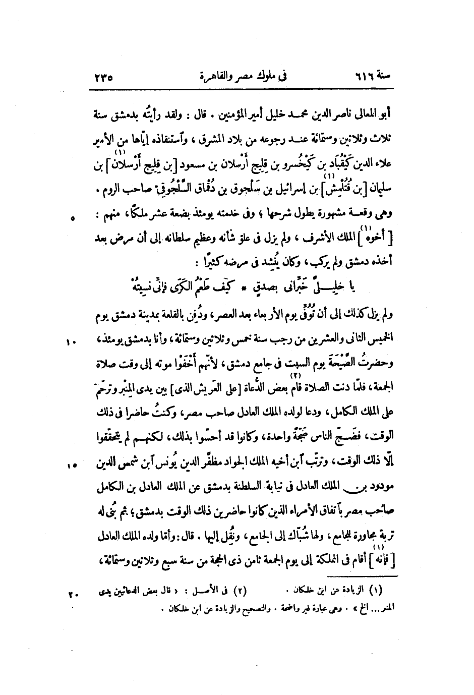أبو المعالى ناصر الدين محمد خليل أمير المؤمنين. قال: ولقد رأيته بدمشق سنة ثلاث وثلاثين وستمائة عند رجوعه من بلاد المشرق، واستنقاذه إيّاها من الأمير علاء الدين كيقباد بن كيخسرو بن قليج أرسلان بن مسعود [بن قليج أرسلان «1» ] بن سليمان [بن قتلمش «2» ] بن إسرائيل بن سلجوق بن دقماق السّلجوقىّ صاحب الروم.