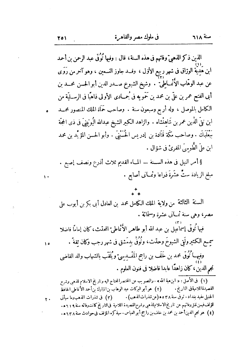 الذين ذكر الذهبىّ وفاتهم فى هذه السنة، قال: وفيها توفّى عبد الرحمن بن أحمد ابن هديّة «1» الورّاق فى شهر ربيع الأوّل، وقد جاوز التسعين، وهو آخر من روى عن عبد الوهّاب الأنماطىّ «2» . وشيخ الشيوخ صدر الدين أبو الحسن محمد بن أبى الفتح عمر بن علىّ بن محمد بن حمّويه فى جمادى الأولى ذاهبا فى الرسليّة من الكامل بالموصل، وله أربع وسبعون سنة. وصاحب حماة الملك المنصور محمد ابن تقىّ الدّين عمر بن شاهنشاه. والزاهد الكبير الشيخ عبد الله اليونينىّ فى ذى الحجّة ببعلبك. وصاحب مكّة قتادة بن إدريس الحسينىّ. وأبو الحسن المؤيّد بن محمد ابن على الطّوسى المقرئ فى شوّال.