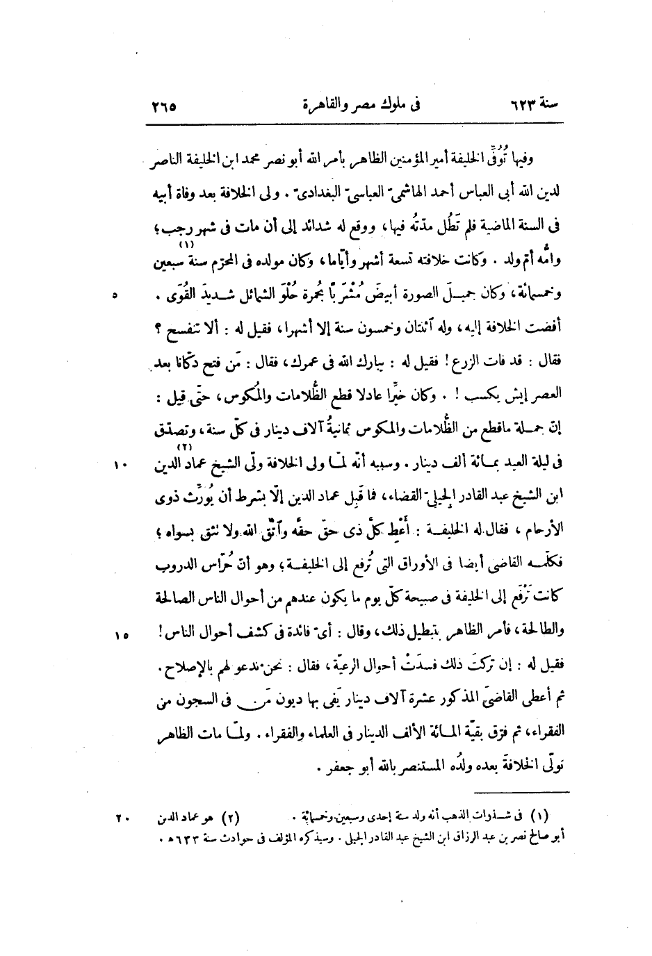 ثم أعطى القاضى المذكور عشرة آلاف دينار يفى بها ديون من فى السجون من الفقراء، ثم فرّق بقيّة المائة الألف الدينار فى العلماء والفقراء. ولمّا مات الظاهر تولّى الخلافة بعده ولده المستنصر بالله أبو جعفر.