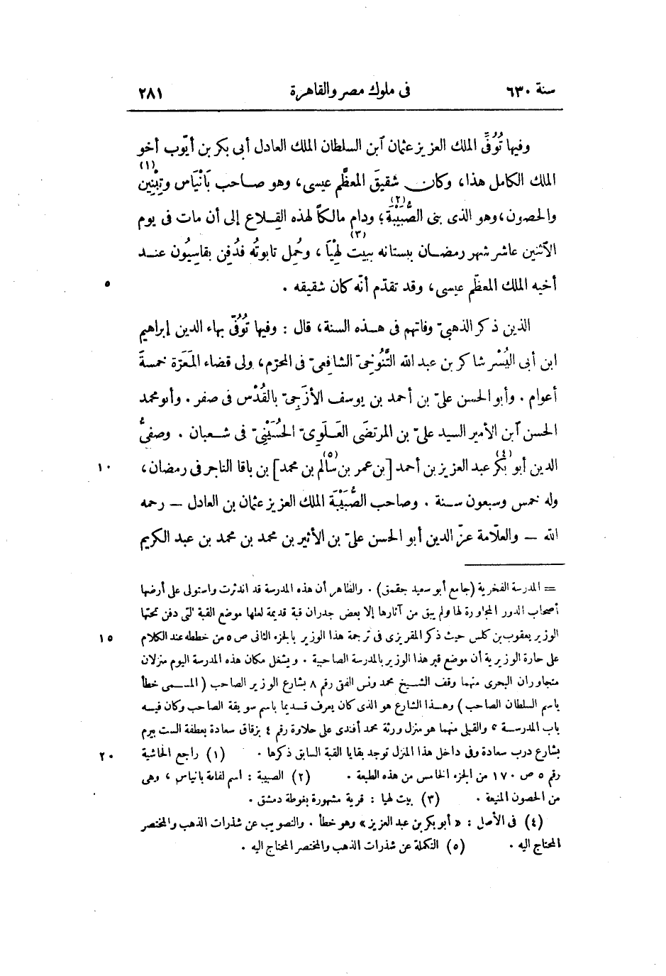وفيها توفّى الملك العزيز عثمان ابن السلطان الملك العادل أبى بكر بن أيّوب أخو الملك الكامل هذا، وكان شقيق المعظّم عيسى، وهو صاحب بانياس وتبنين «1» والحصون، وهو الذي بنى الصّبيبة «2» ؛ ودام مالكا لهذه القلاع إلى أن مات فى يوم الاثنين عاشر شهر رمضان ببستانه ببيت «3» لهيا، وحمل تابوته فدفن بقاسيون عند أخيه الملك المعظّم عيسى، وقد تقدّم أنّه كان شقيقه.