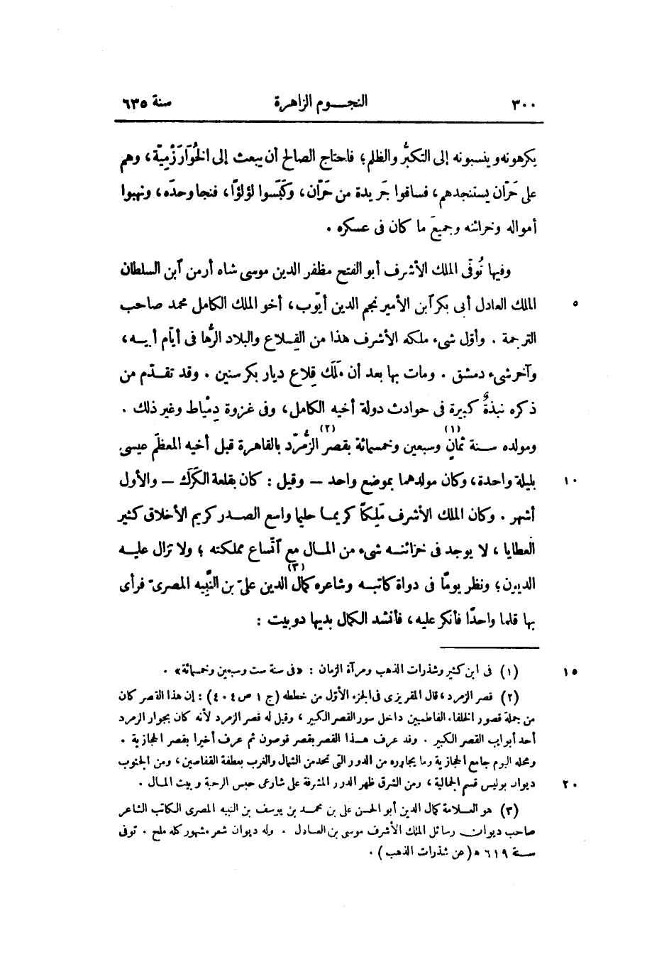 وفيها توفّى الملك الأشرف أبو الفتح مظفر الدين موسى شاه أرمن ابن السلطان الملك العادل أبى بكر ابن الأمير نجم الدين أيّوب، أخو الملك الكامل محمد صاحب الترجمة. وأوّل شىء ملكه الأشرف هذا من القلاع والبلاد الرّها فى أيّام أبيه، وآخر شىء دمشق. ومات بها بعد أن ملك قلاع ديار بكر سنين. وقد تقدّم من ذكره نبذة كبيرة فى حوادث دولة أخيه الكامل، وفى غزوة دمياط وغير ذلك.