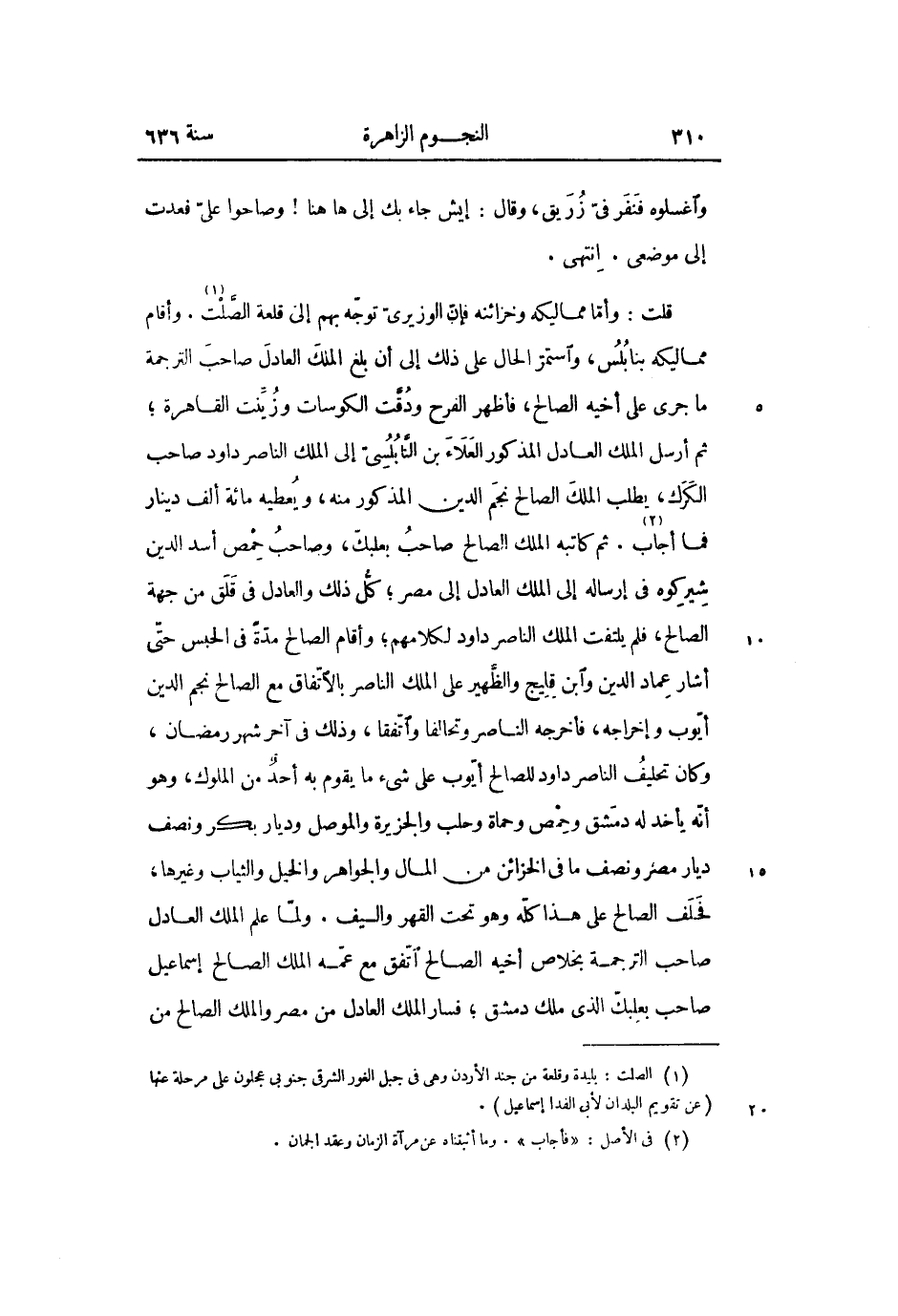 . وأقام مماليكه بنابلس، واستمرّ الحال على ذلك إلى أن بلغ الملك العادل صاحب الترجمة ما جرى على أخيه الصالح، فأظهر الفرح ودقّت الكوسات وزيّنت القاهرة؛ ثم أرسل الملك العادل المذكور العلاء بن النّابلسىّ إلى الملك الناصر داود صاحب الكرك، يطلب الملك الصالح نجم الدين المذكور منه، ويعطيه مائة ألف دينار فما أجاب «2»