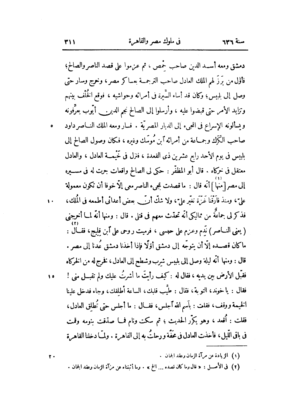 دمشق ومعه أسد الدين صاحب حمص، ثم عزموا على قصد الناصر والصالح؛ فأوّل من برز لهم الملك العادل صاحب الترجمة بعساكر مصر، وخرج وسار حتى وصل إلى بلبيس؛ وكان قد أساء السّيرة فى أمرائه وحواشيه، فوقع الخلف بينهم وتزايد الأمر حتى قبضوا عليه، وأرسلوا إلى الصالح نجم الدين أيّوب يعرّفونه ويسألونه الإسراع فى المجىء إلى الديار المصريّة. فسار ومعه الملك الناصر داود صاحب الكرك وجماعة من أمرائه ابن موسك وغيره، فكان وصول الصالح إلى بلبيس فى يوم الأحد رابع عشرين ذى القعدة، فنزل فى خيمة العادل، والعادل معتقل فى خركاه. قال أبو المظفّر: حكى لى الصالح واقعات جرت له فى مسيره إلى مصر [منها «1»