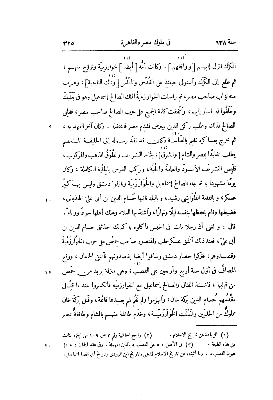 قال: وبلغنى أنّ رجلا مات فى الحبس فأكلوه؛ كذلك حدّثنى حسام الدين بن أبى علىّ، فعند ذلك اتّفق عسكر حلب والمنصور صاحب حمص على حرب الخوارزميّة وقصدوهم، فتركوا حصار دمشق وساقوا أيضا يقصدونهم فالتقى الجمعان، ووقع المصافّ فى أوّل سنة أربع وأربعين على القصب «6» ، وهى منزلة بريد من حمص من قبليها، فاشتدّ القتال والصالح إسماعيل مع الخوارزميّة فانكسروا عند ما قتل مقدّمهم حسام الدين بركة خان، وانهزموا ولم تقم لهم بعدها قائمة، وقتل بركة خان مملوك من الحلبيّين وتشتّتت الخوارزميّة، وخدم طائفة منهم بالشام وطائفة بمصر