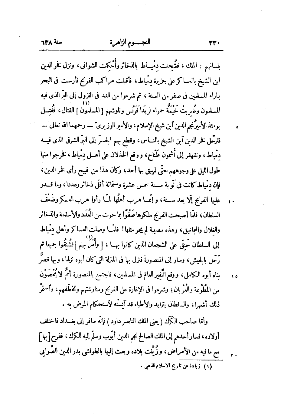 بلسانهم: الملك، فشحنت دمياط بالذخائر وأحكمت الشوانى، ونزل فخر الدين ابن الشيخ بالعساكر على جزيرة دمياط، فأقبلت مراكب الفرنج فأرست فى البحر بازاء المسلمين فى صفر من الستة، ثم شرعوا من الغد فى النزول إلى البرّ الذي فيه المسلمون وضربت خيمة حمراء لريدا فرنس وناوشهم [المسلمون «1» ] القتال، فقتل يومئذ الأمير نجم الدين ابن شيخ الإسلام، والأمير الوزيرىّ- رحمهما الله تعالى- فترحّل فخر الدين ابن الشيخ بالناس، وقطع بهم الجسر إلى البرّ الشرقى الذي فيه دمياط، وتقهقر إلى أشمون طنّاح، ووقع الخذلان على أهل دمياط، فخرجوا منها طول الليل على وجوههم حتّى لم يبق بها أحد؛ وكان هذا من قبيح رأى فخر الدين، فإنّ دمياط كانت فى نوبة سنة خمس عشرة وستمائة أقلّ ذخائر وعددا، وما قدر عليها الفرنج إلّا بعد سنة، وإنّما هرب أهلها لمّا رأوا هرب العسكر وضعف السلطان؛ فلمّا أصبحت الفرنج ملكوها صفوا بما حوت من العدد والأسلحة والذخائر والغلال والمجانيق، وهذه مصيبة لم يجر مثلها! فلمّا وصلت العساكر وأهل دمياط إلى السلطان حنق على الشجعان الذين كانوا بها، [وأمر «2» بهم] فشنقوا جميعا ثم رحل بالجيش، وسار إلى المنصورة فنزل بها فى المنزلة التى كان أبوه نزلها، وبها قصر بناه أبوه الكامل، ووقع النّفير العامّ فى المسلمين، فاجتمع بالمنصورة أمم لا يحصون من المطّوّعة والعربان؛ وشرعوا فى الإغارة على الفرنج ومناوشتهم وتخطّفهم، واستمرّ ذلك أشهرا، والسلطان يتزايد والأطباء قد آيسته لاستحكام المرض به.