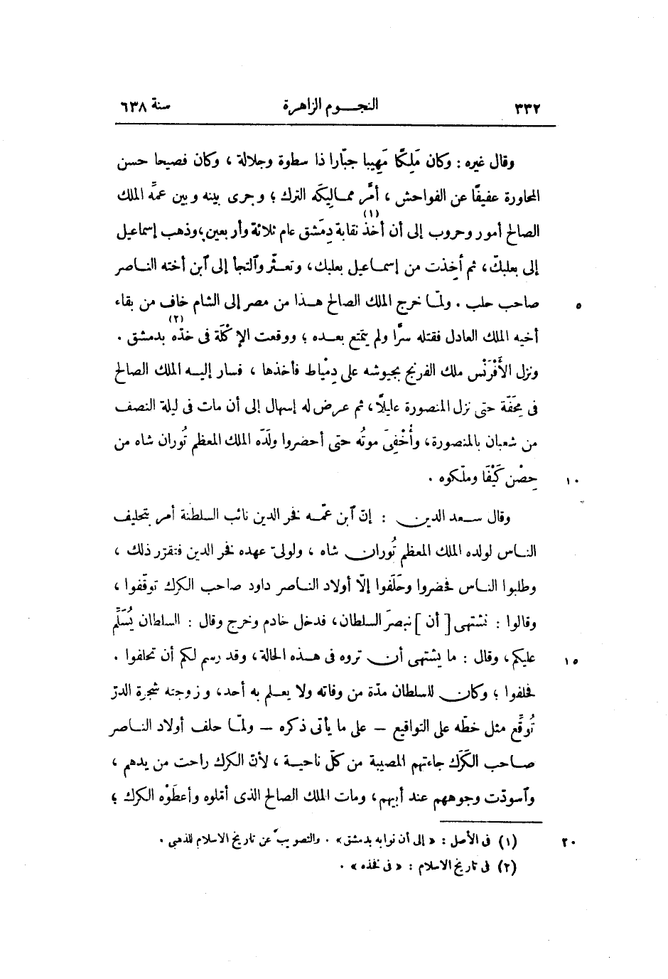 وقال غيره: وكان ملكا مهيبا جبّارا ذا سطوة وجلالة، وكان فصيحا حسن المحاورة عفيفا عن الفواحش، أمّر مماليكه الترك؛ وجرى بينه وبين عمّه الملك الصالح أمور وحروب إلى أن أخذ «1» نقابة دمشق عام ثلاثة وأربعين؛ وذهب إسماعيل إلى بعلبكّ، ثم أخذت من إسماعيل بعلبك، وتعثّر والتجأ إلى ابن أخته الناصر صاحب حلب. ولمّا خرج الملك الصالح هذا من مصر إلى الشام خاف من بقاء أخيه الملك العادل فقتله سرّا ولم يتمتع بعده؛ ووقعت الأكلة فى خدّه «2» بدمشق.