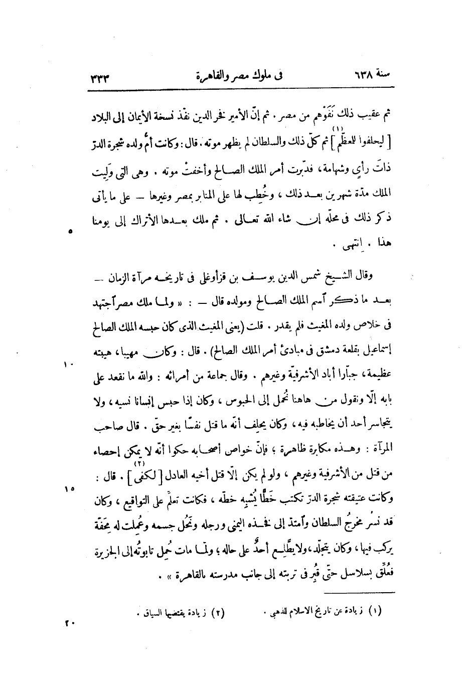 ثم عقيب ذلك نفوهم من مصر. ثم إنّ الأمير فخر الدين نفذ نسخة الأيمان إلى البلاد [ليحلفوا للمعظّم «1» ] ثم كلّ ذلك والسلطان لم يظهر موته. قال: وكانت أمّ ولده شجرة الدرّ ذات رأى وشهامة، فدبّرت أمر الملك الصالح وأخفت موته. وهى التى وليت الملك مدّة شهرين بعد ذلك، وخطب لها على المنابر بمصر وغيرها- على ما يأتى ذكر ذلك فى محلّه إن شاء الله تعالى. ثم ملك بعدها الأتراك إلى يومنا هذا. انتهى.