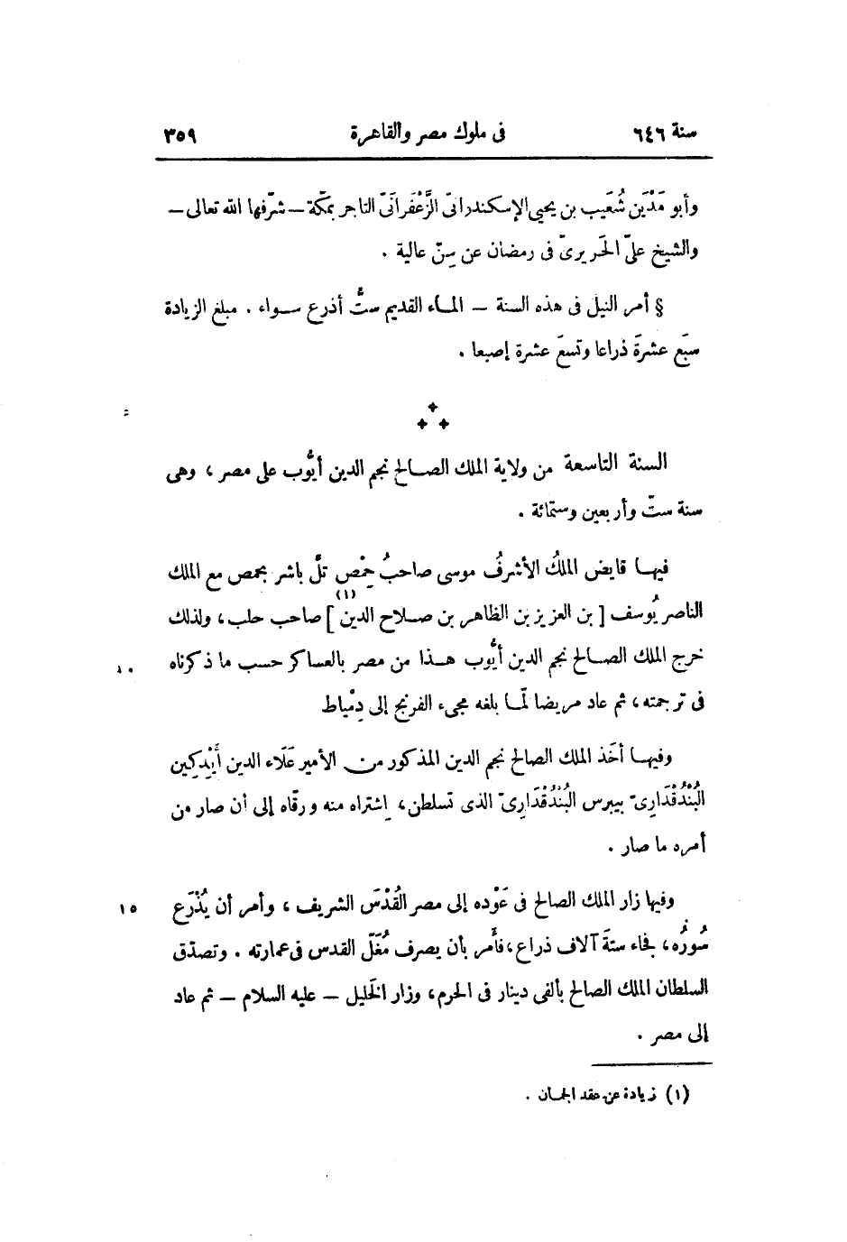 وفيها زار الملك الصالح فى عوده إلى مصر القدس الشريف، وأمر أن يذرع سوره، فجاء ستة آلاف ذراع، فأمر بأن يصرف مغلّ القدس فى عمارته. وتصدّق السلطان الملك الصالح بألفى دينار فى الحرم، وزار الخليل- عليه السلام- ثم عاد إلى مصر.