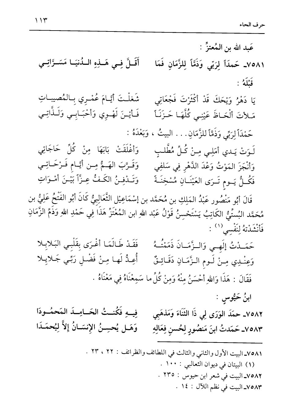 قَالَ أَبُو مَنْصور عَبْدُ المَلِكِ بن مُحَمَّد بن إسْمَاعِيْل الثَّعَالِبِيُّ كَانَ أَبُو الفَتْحُ عَلِيُّ بن مُحَمَّد البُستِّيُّ الكَاتِبُ يَسْتَحْسِنُ قَوْلُ عَبْد اللَّهِ ابن المُعْتَزِّ هَذَا فِي حَمْدِ اللَّهِ وَذَمِّ الزمَانِ فَأنْشَدْتهُ لِنَفْسِي (¬1):