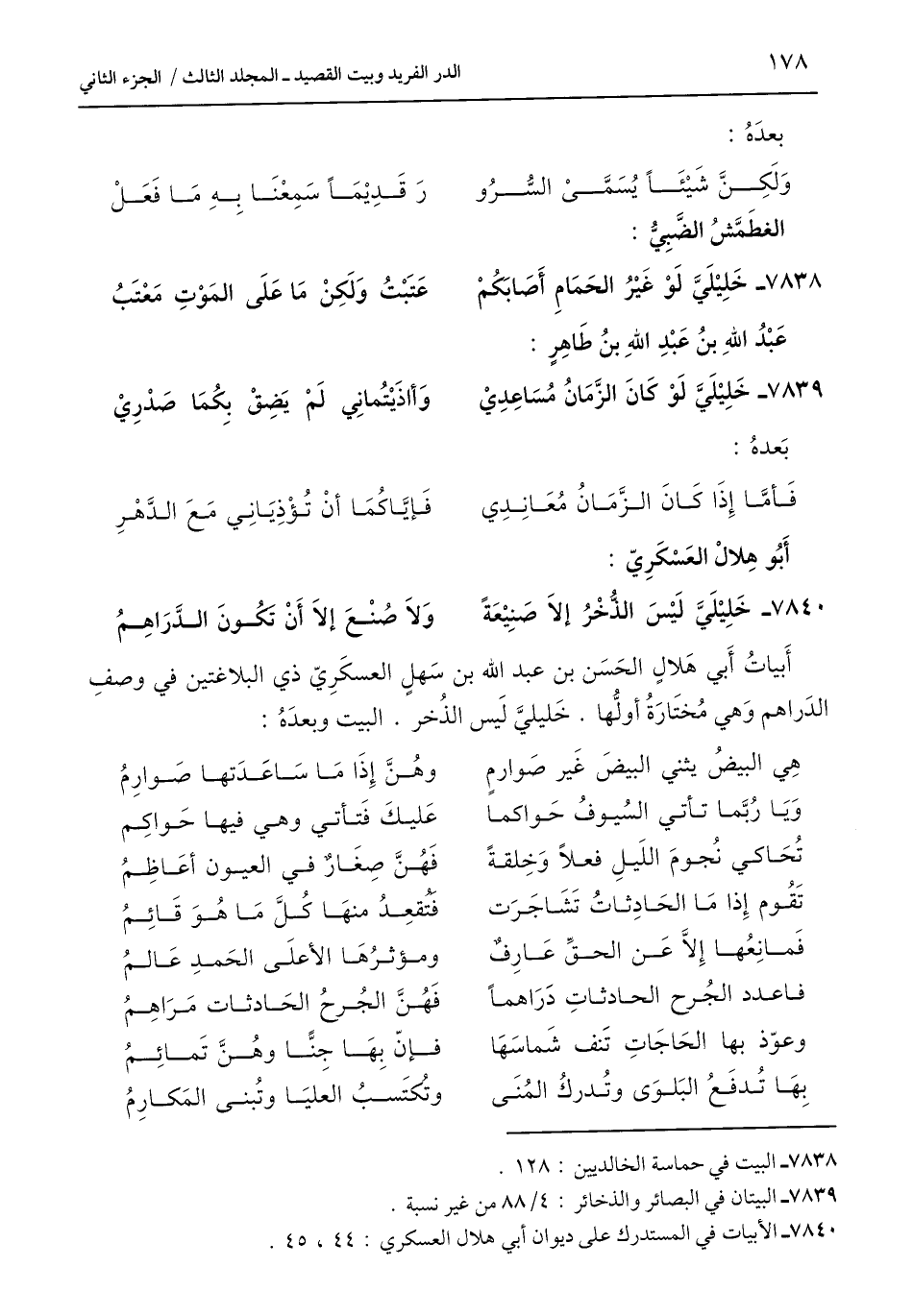 أَبياتُ أَبِي هَلالٍ الحَسَن بن عبد اللَّه بن سَهلٍ العسكَرِيّ ذي البلاغتين في وصفِ الدَراهم وَهي مُختَارَةُ أولُّها. خَليليَّ لَيس الذُخر. البيت وبعدَهُ: