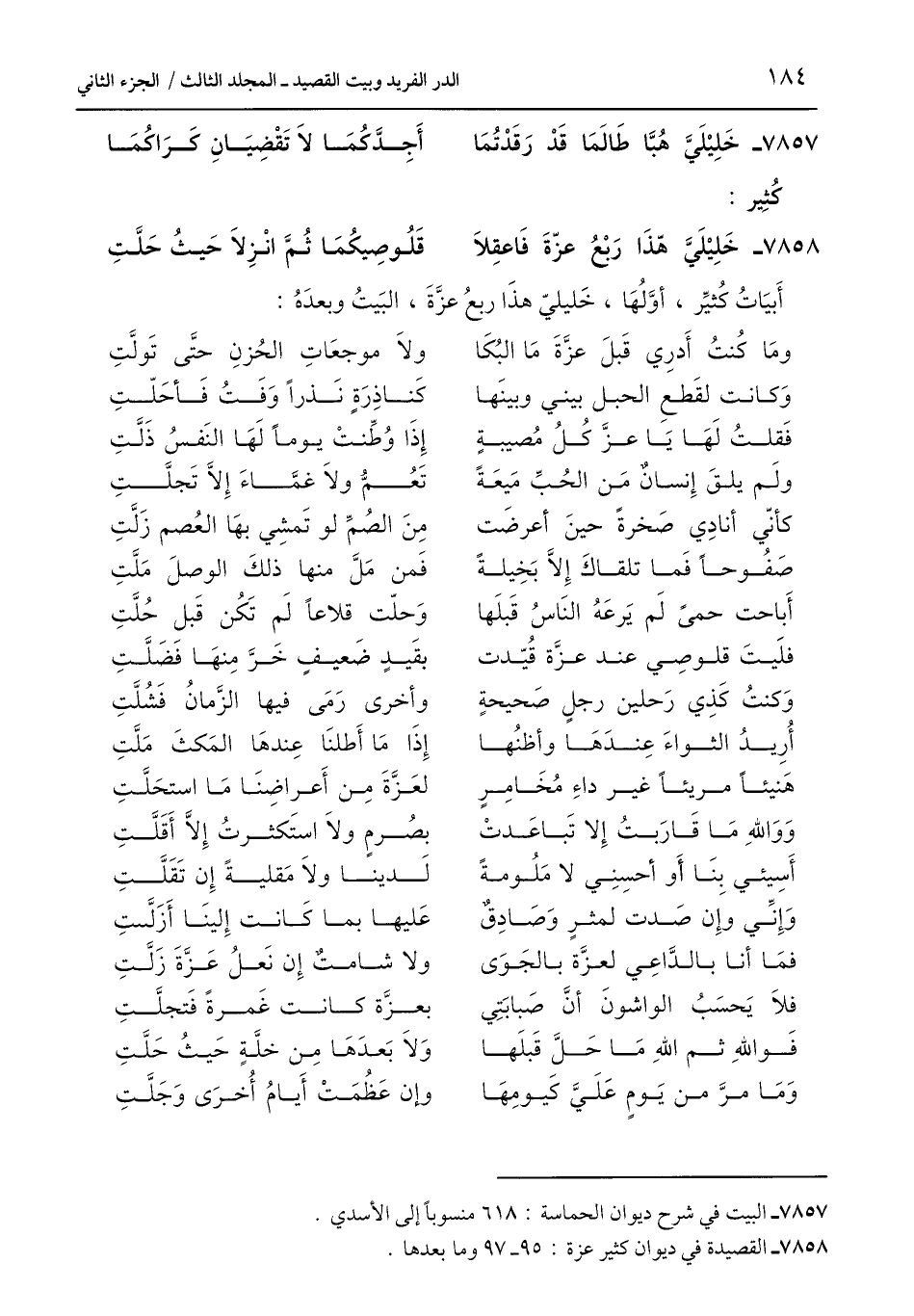 7857 - خَلِيْلَيَّ هّذَا رَبْعُ عزّةَ فَاعقِلَا ... قَلُوصِيكُمَا ثُمَّ انْزِلَا حَيثُ حَلَّتِ