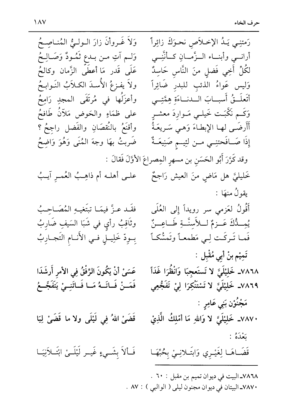 7870 - البيتان في ديوان مجنون ليلى (الوالبي): 87.