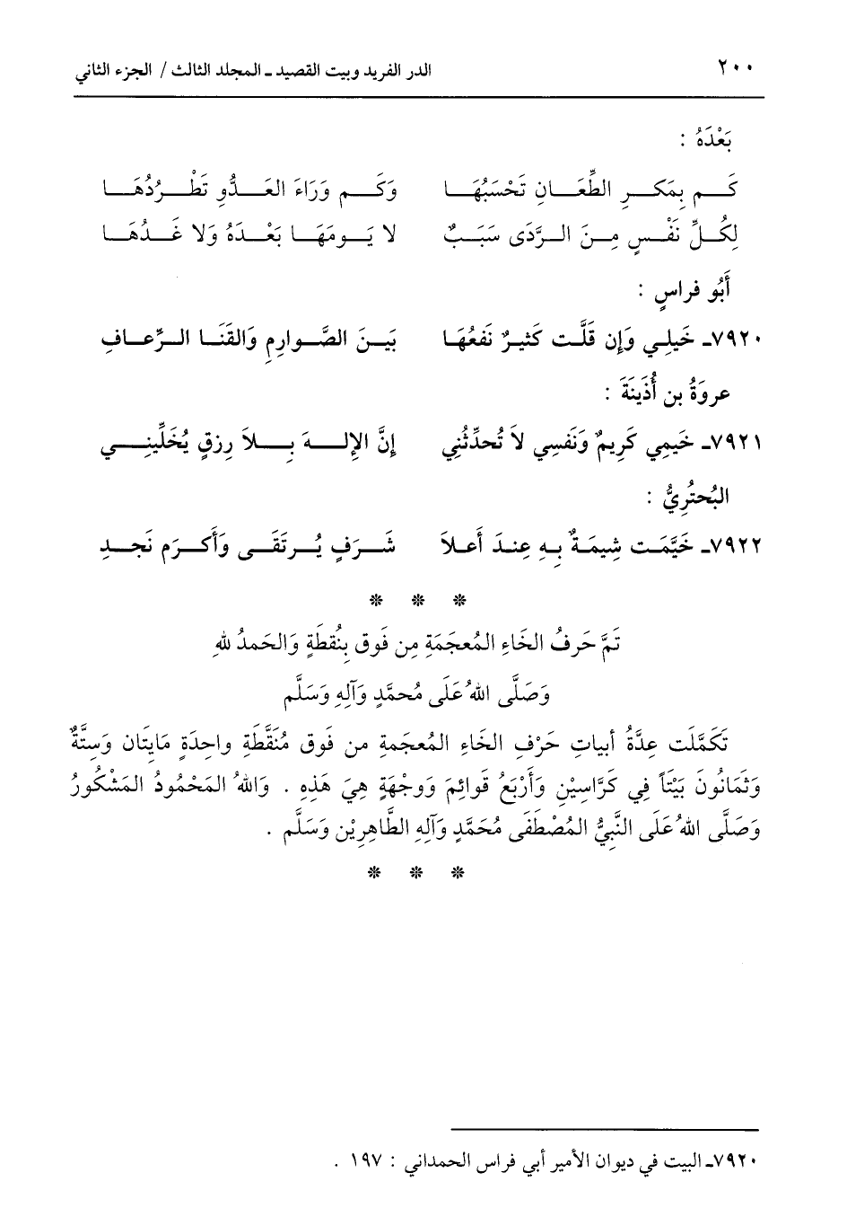 تَكَمَّلَت عِدَّةُ أبياتِ حَرْفِ الخَاءِ المُعجَمةِ من فَوق مُنَقَّطَةِ واحِدَةٍ مَائتَان وَسِتَّةٌ وَثَمَانُونَ بَيْتًا فِي كَرَّاسِيْنِ وَأَرْبَعُ قَوائِمَ وَوجْهَةٍ هِيَ هَذِهِ. وَاللَّهُ المَحْمُودُ المَشْكُورُ وَصَلَّى اللَّهُ عَلَى النَّبِيُّ المُصْطَفَى مُحَمَّدٍ وَآلِهِ الطَّاهِرِيْن وَسَلَّم.