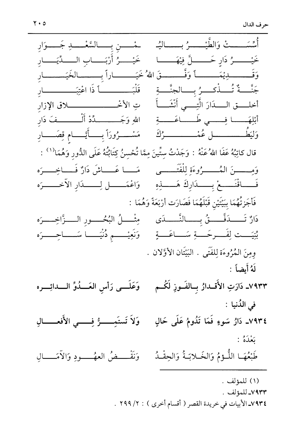 قال كَاتِبُهُ عَفَا اللَّهُ عَنْهُ: وَجَدْتُ سِتِّينَ مِمَّا تُحْسِنُ كِتَابُتُهُ عَلَى الدُّورِ وَهُمَا (¬1):