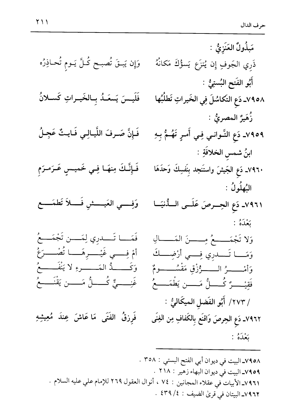 7961 - الأبيات في عقلاء المجانين: 74، أنوال العقول 269 للإمام علي عليه السلام.