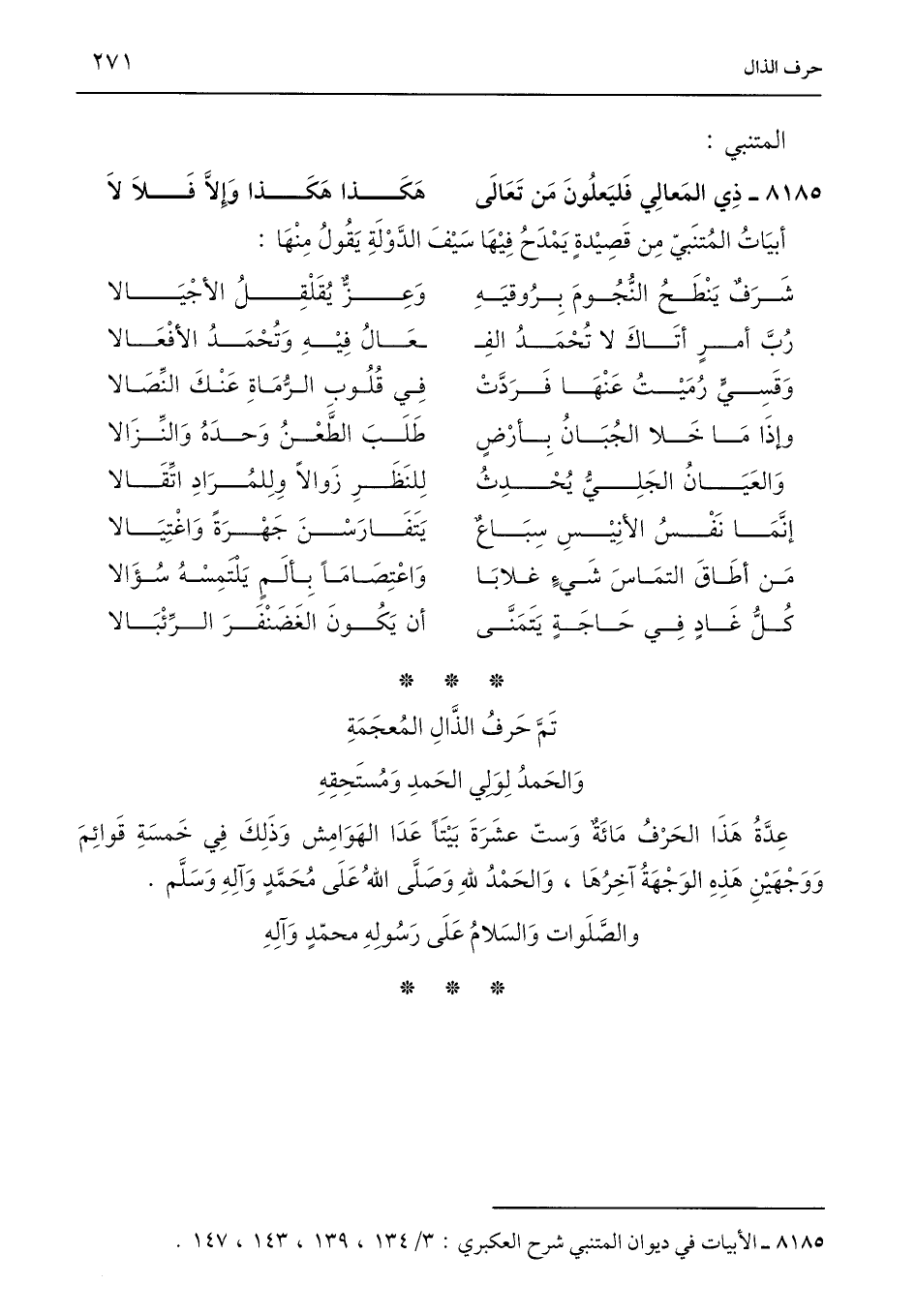 عِدَّةُ هذَا الحَرْفُ مَائَةٌ وَستّ عشَرَةَ بَيْتًا عَدَا الهوَامِش وَذَلِكَ فِي خَمسَةِ قَوائِمَ وَوَجهيْنِ هذِهِ الوَجْهةُ آخِرُها، وَالحَمدُ للَّهِ وَصَلَّى اللَّهُ عَلَى مُحَمَّدٍ وآلِهِ وَسَلَّم.